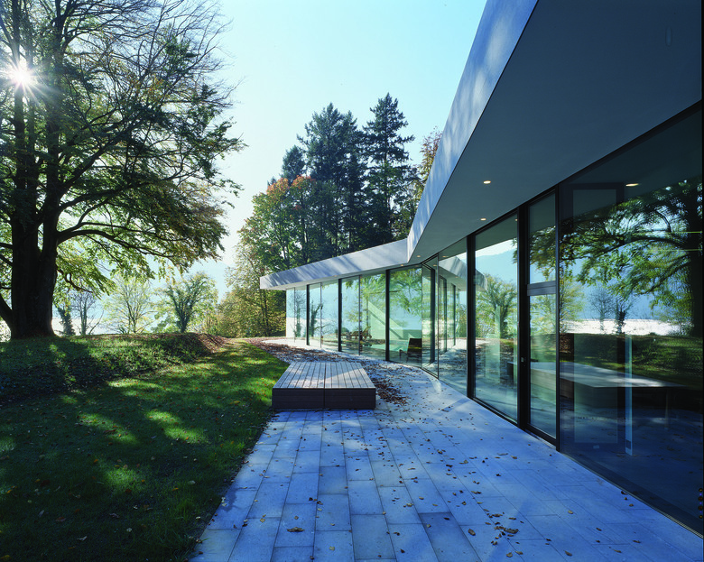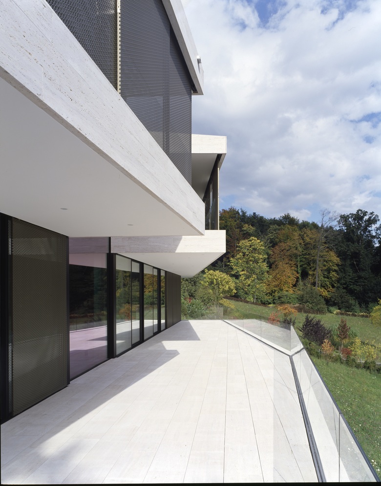 Die Auskragungen dienen als Sonnen- und Wetterschutz, zu¬gleich sind sie als gedeckte und geschützte Aufenthaltsräume im Freien nutzbar. Das Untergeschoss ist als zurückversetzte «Fuge» vom See her sichtbar und betont damit die Horizontali¬tät der prägnanten Geschossplatten. Das Dach ist als zurück¬haltend, flachgeneigtes Walmdach konzipiert.