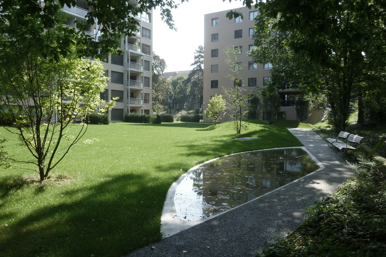 Der Sevogelpark umschliesst die neue Wohnüberbauung wie eine Klammer. Besonderen Wert wurde auf den bestehenden Baumbestand und dessen Unterwuchs mit zahlreichen seltenen heimischen Geophyten gelegt. Sich öffnende und schliessende Wege erschliessen den Park und führen die Bewohner unter das Kronendach der bestehenden Bäume. Die Wege schneiden sich in flache Rasenpyramiden ein. Eine Wasserschale spiegelt die Umgebung wieder, und mit etwas Glück kann der Besucher den badenden Vögeln zuschauen. Eine Blutbuche steht im Zentrum zwischen den beiden Gebäuden und markiert einen weiteren Aufenthaltsort. In Anlehnung an die Parktypologie wurde auf der langen Sichtachse eine Heckenlandschaft aus „tanzenden Eibenstreifen“ gepflanzt. Diese dienen unter anderem auch dem Sichtschutz und der Einteilung der privaten Gartenanteile im Erdgeschoss.
