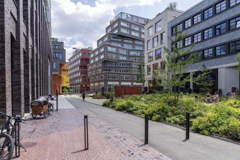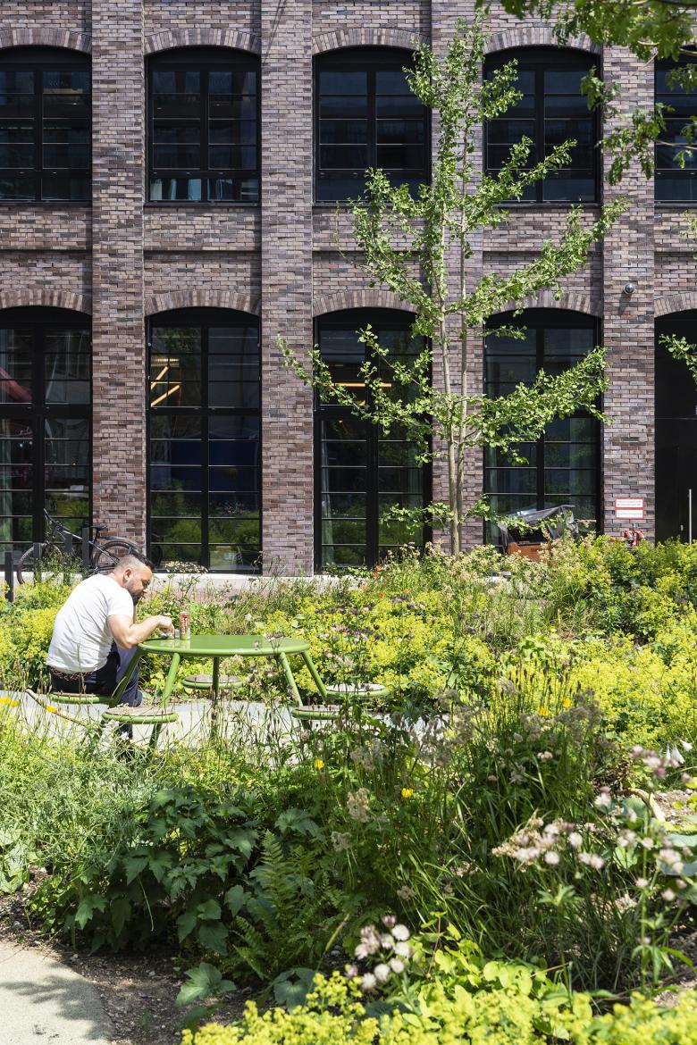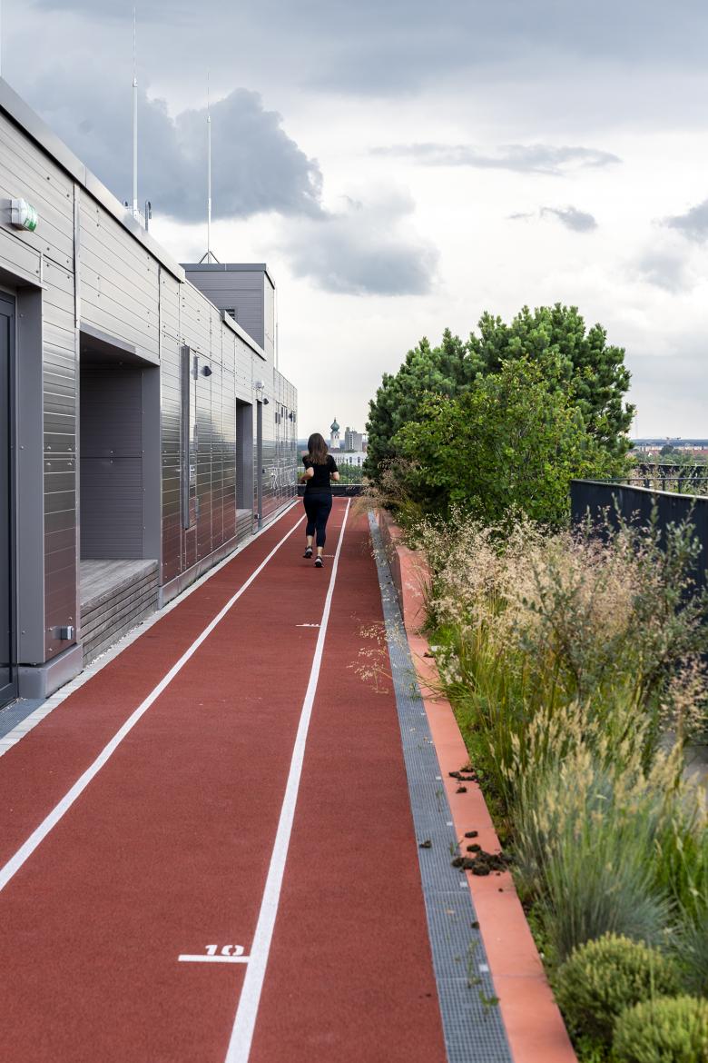 Eine lebendige, vielseitig nutzbare und intensiv begrünte Dachlandschaft ergänzt die Freiflächen. Mit Sportangeboten, Aussichtsterrassen, Urban Gardening Flächen und Außenarbeitsbereichen spiegeln die Dachflächen der Macherei das breite Bedürfnis nach unterschiedlichen Aufenthalts- und Betätigungsangeboten in der modernen Arbeitswelt wieder.
