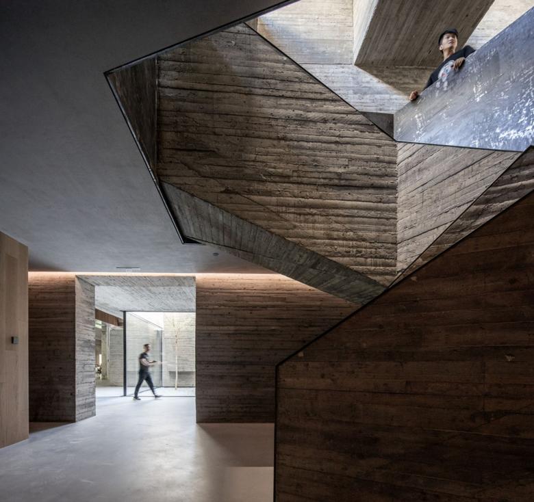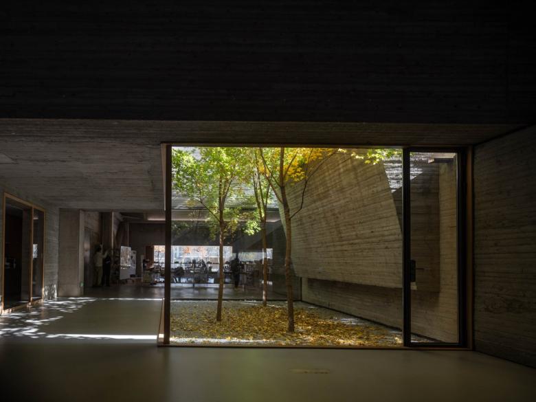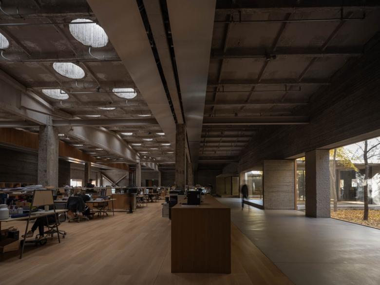 The actual main office area is a big hall divided in two though a stripe-shaped courtyard subtracted from the original building volume. The introvert yet open spatial configuration as well as the atmospheric light brings to mind traditional courtyard typologies in the historic center of Beijing.