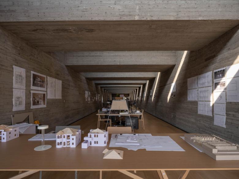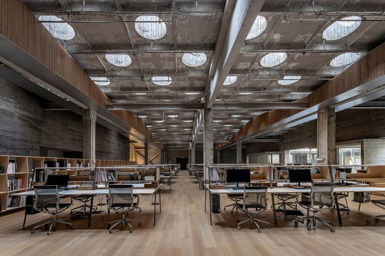 Further north, a sculptural triple-run stairs leads to the executive lounge on the second floor. A regular, monumental series of skylights cast in concrete bright up the space. Towards the east, one can access the roof of the library pavilion, from where one overviews the entire campus.