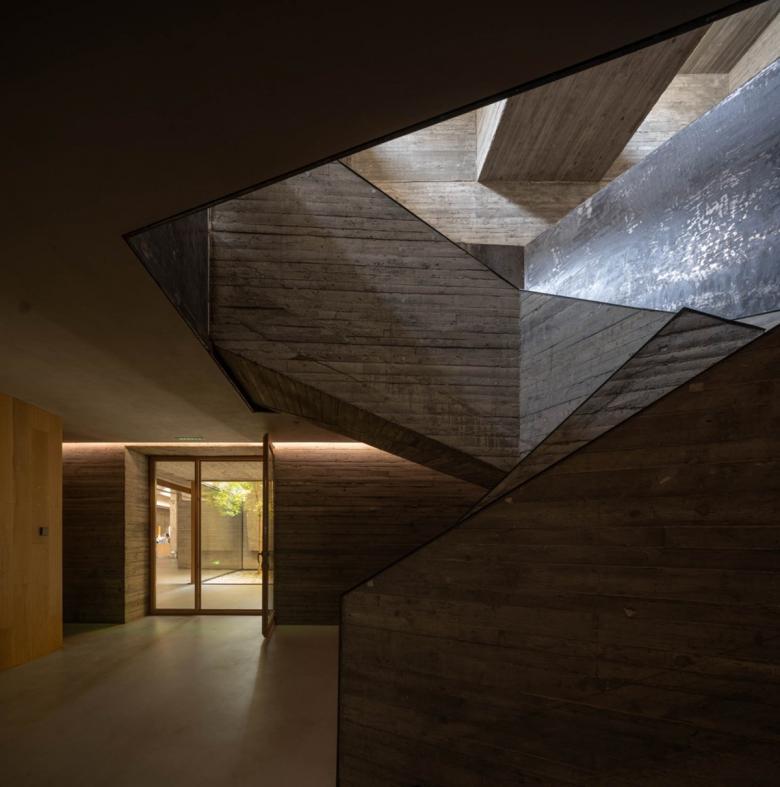 The building is divided into a sequence of four separate areas and a library pavilion attached to it. In contrast to the existing, strictly right-angled architecture, the entrance area forms a spatial surprise. One enters from south into a two-story-high, sculptural space illuminated by a thin slit in the bent roof.