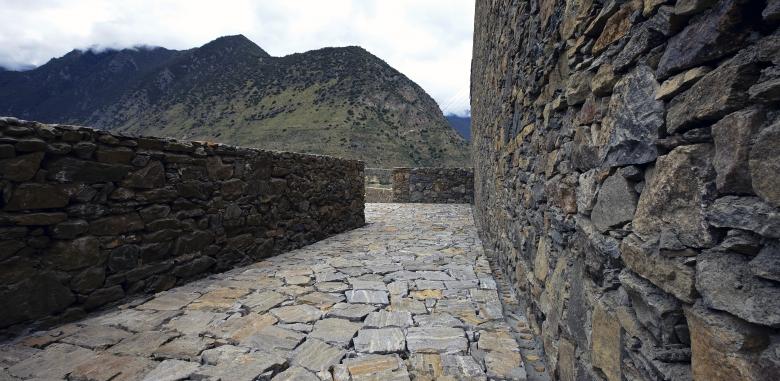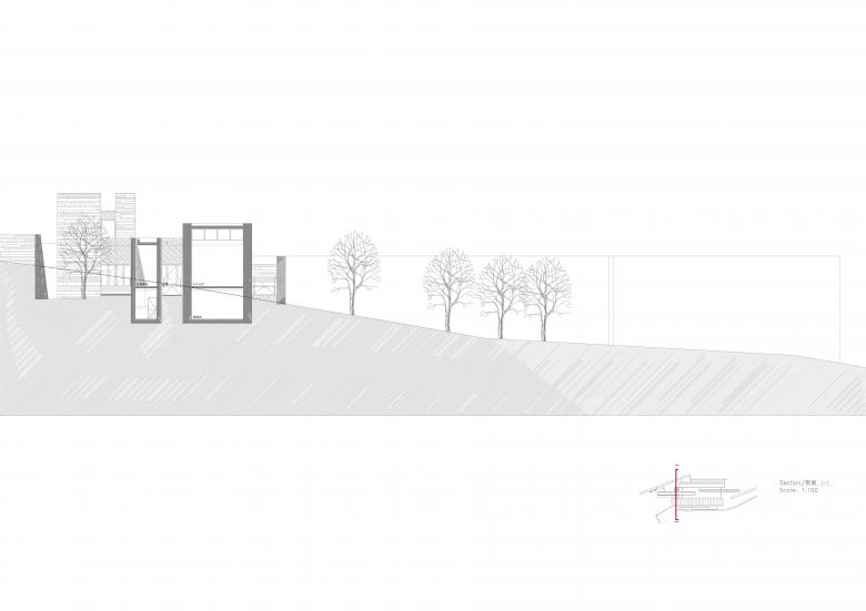 Like a few slices of rock extending out of the mountain, the building is conceived as a series of stone walls set into the slope, with no windows facing the incoming road from the west. Approaching from the road people cannot be sure if this is a building or a row of retaining walls or even a Mani wall (to pay homage to the spirit of the place) at the foot of the mountain. A stone retaining wall leads to the entrance with the reception and exhibition hall. The main hall is lit by skylights and has a panoramic window that frames the view to the north towards the village and the Yarlung Tsangpo River. The public toilets and the luggage storage are placed behind a one-metre-thick stone wall, while further behind the next stone wall the internet café, medical clinic and the drivers’ rest space are located. Halfway between the two, a staircase leads to the second floor with the roof garden and meeting rooms. The water tank is hidden beneath the stairs and the elec-trical switch room is located in the basement.