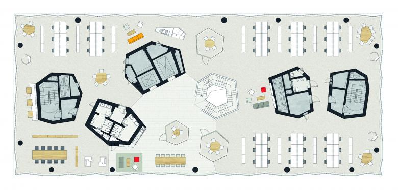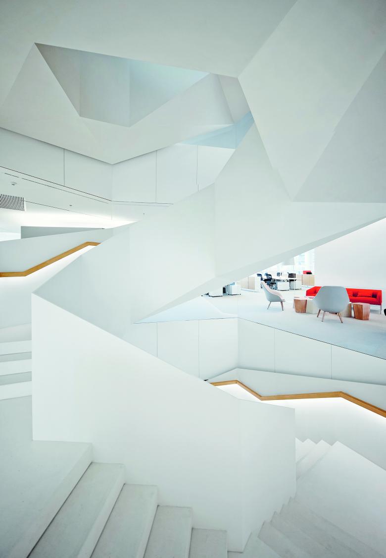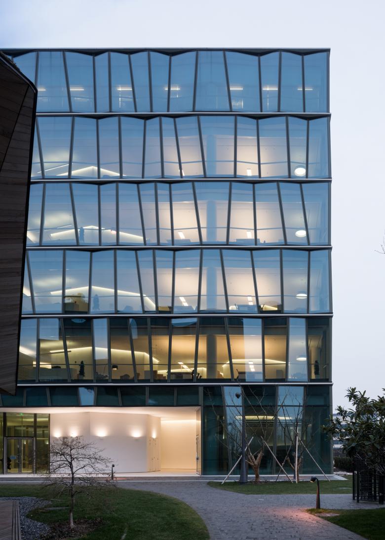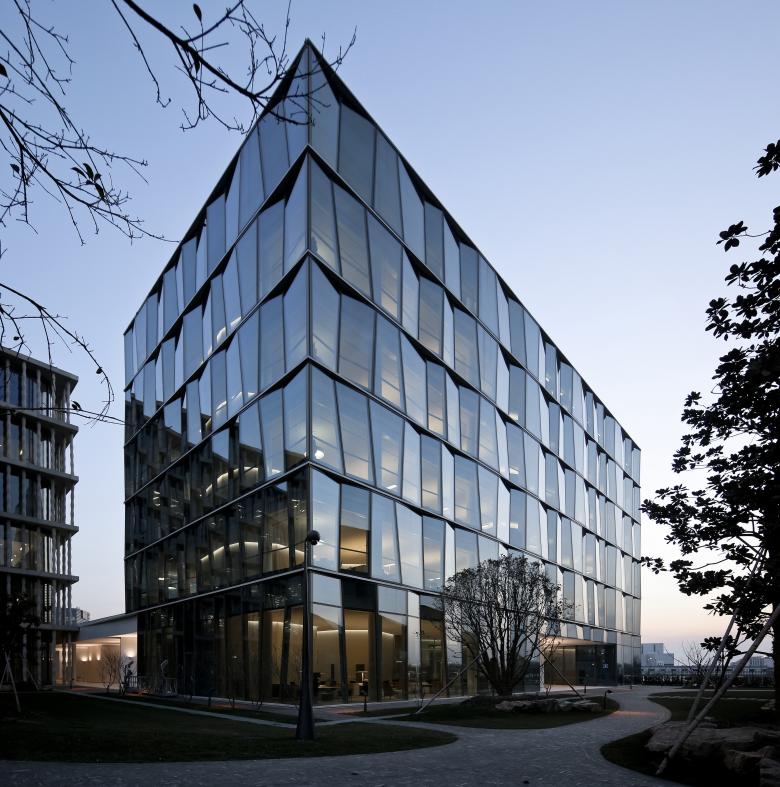The campus of the Swiss pharmaceutical company Novartis is located along the linear Chuanyang River in Pudong, halfway between the centre of the city and the airport. Here, the architects erected a research and development centre, whose architecture is designed to encourage innovative communication between the employees. The six-storey office building with a one-storey base floor consisting of open passageways, small patios, and pavilions accommodates flexibly usable spaces equipped with individual features. The design is based on a cellular grid inspired by traditional Chinese garden design. The interior courtyards positioned on polygonal foundation elements incised into the base connect the meandering pavilions and merge inside and outside. The planting and materiality on the ground floor level form a calming contrast to the polygonal aesthetic of the spaces and to the folded glass façade of the main building, which is perceived from a distance as a shimmering surface. The ‘in-between’ character of the garden and architecture thus remains in limbo and reflects historical values of design in a contemporary way, without becoming lost in formal copies.