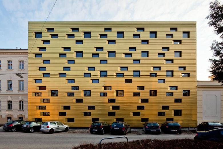 Die goldene Maske – Die Erweiterung und Erneuerung des Gerichtsgebäudes St. Pölten inkludiert einen neu entwickelten Zubau für Büronutzungen.Städtebaulich schließt der neue Zubau die Lücke zwischen altem Gerichtsgebäude und der angrenzenden Justizanstalt in Form einer kohärenten Ergänzung des denkmalgeschützten Baus mit einem zeitgenössischen Zubau, der einerseits selbstbewusst und eigenständig als Solitär nach außen wahrnehmbar ist, zugleich jedoch den historischen Kontext respektiert und zwischen moderner und historischer Formensprache zu vermitteln vermag.