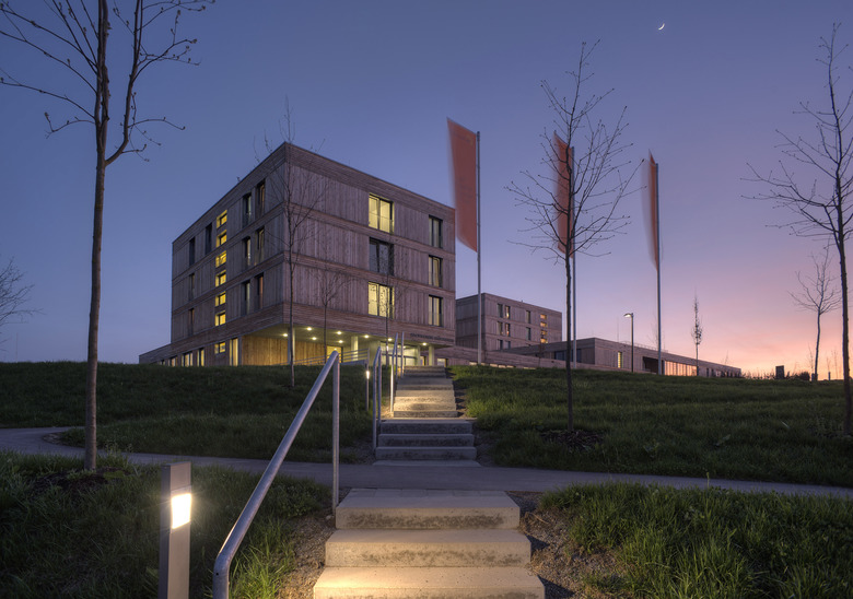 Hinsichtlich der Materialität und der Details haben wir nach einfachen und nachhaltigen Lösungen gesucht. Eine naturbelassene Schalung aus heimischem Lärchenholz, welche im Lauf der Zeit eine silbergraue Färbung einnehmen wird, trägt dazu bei, das große Gebäude als Teil der Landschaft zu begreifen.