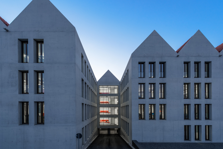 Gestalterische Raffinesse zeigt sich in der Gliederung der viergeschossigen Baukörper mit mehreren Doppelgiebeln, die unverkennbar ihren Bezug zur Altstadtstruktur unterstreichen und der hochwertigen fugenlosen, freitragenden Sichtbetonfassade, die wiederum ihren modernen Charakter betont.