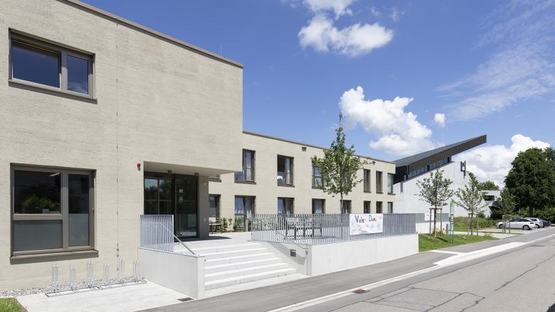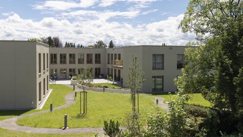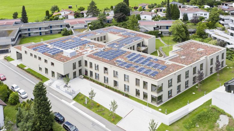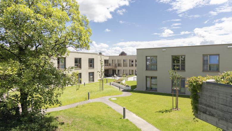 Der kompakte, zweigeschossige und durchgehend zweibündige Atriumbau ist in Stahlbetonskelettkonstruktion und in KFW 40+ ausgeführt. Auf tragende Wände im Bereich der Bewohnerzimmer wurde verzichtet. Die gewählte Konstruktion ermöglicht eine große Flexibilität im Bezug auf Umbauten, Nachinstallationen oder auch Nachnutzungen. Das Gebäude ist durch eine gerastete Lochfassade geprägt. Die Bewohnerzimmer haben großzügige bodentiefe Fenster, was für bettlägerige Bewohner von Bedeutung ist.
