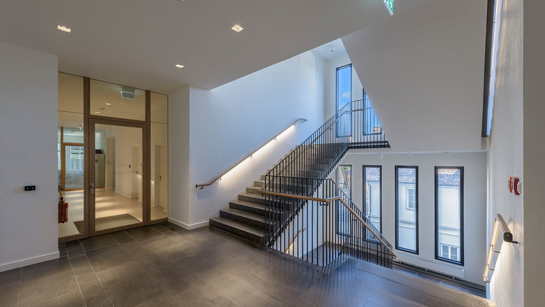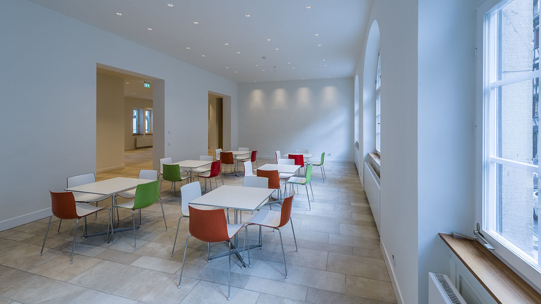 Im Zuge der Sanierung und Restaurierung wurden unter Berücksichtigung hoher Denkmalschutzanforderungen die Technik und der Brandschutz komplett erneuert. Statt kleinteiliger Nebenraumnutzungen öffnet sich das Erdgeschoss nun transparent und bürgernah zum Marktplatz, der Ratssaalvorbereich im 1. Obergeschoss präsentiert sich als großzügige Cafeteria.