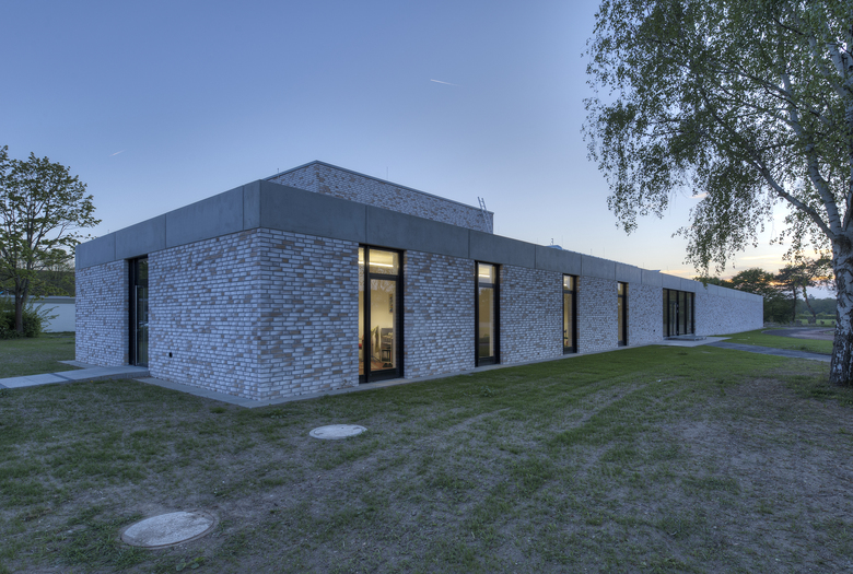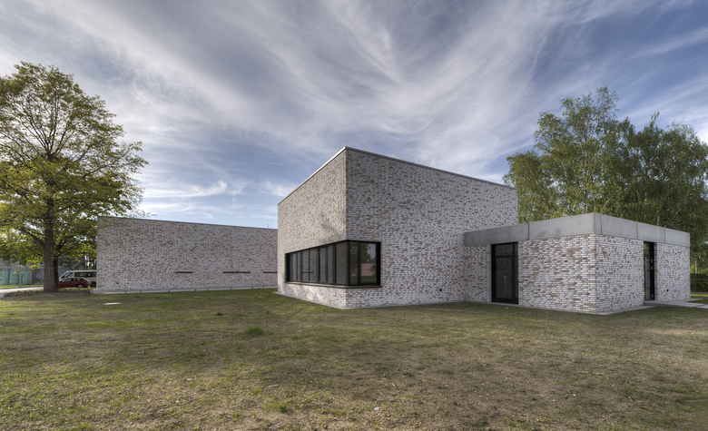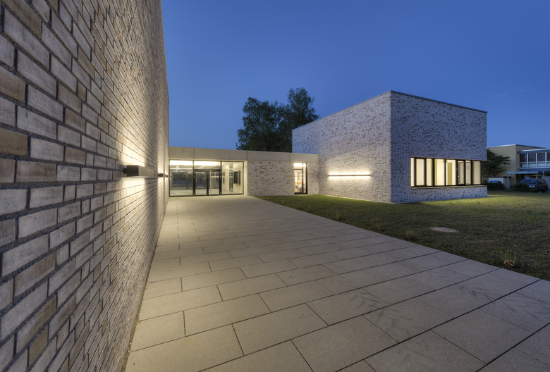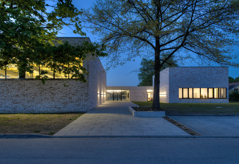 Die beiden Funktionseinheiten „Sporthalle“ und „Gymnastikhalle“ sind markant hervorgehoben und werden durch einen eleganten, eingeschossigen Baukörper miteinander verbunden. Es entstehen wohltuende Proportionen, die sich nahtlos in die Umgebungsbebauung einfügen.