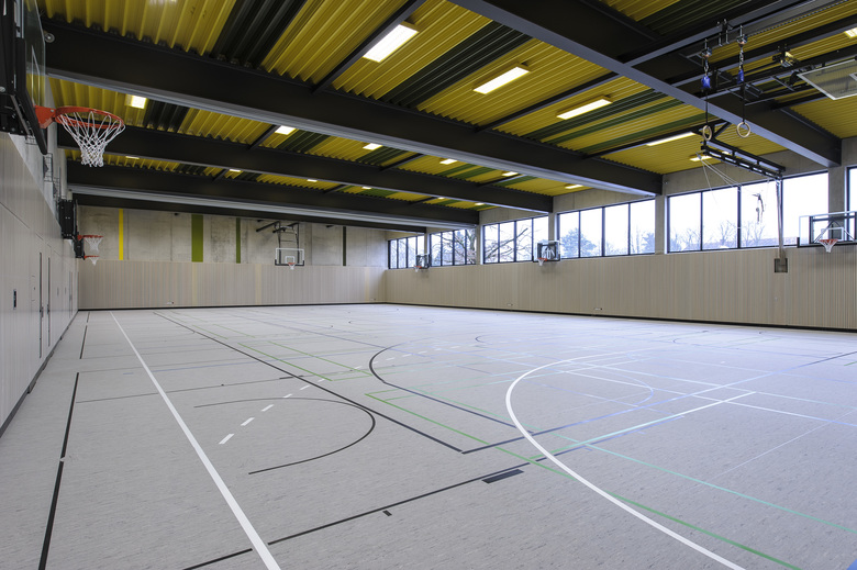 Die Sporthalle liegt westlich der Eingangshalle. Kurze Wege zu den Umkleideräumen sowie eine durchgehende Geräteraumspange auf der Nordseite bestimmen die Funktionalität dieses Bereichs.