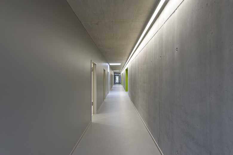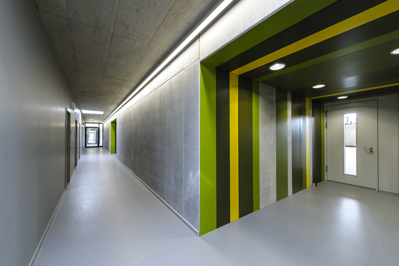 Der Bau ist funktional stringent organisiert. Die zentrale Eingangshalle bildet von beiden Seiten -Campus und Freisportfeld – eine eindeutige Adresse und verbindet die Funktionsbereiche Sporthalle und Gymnastikraum mit dazugehörigem Therapiebereich orientierungsfreundlich, attraktiv, einfach und effizient.
