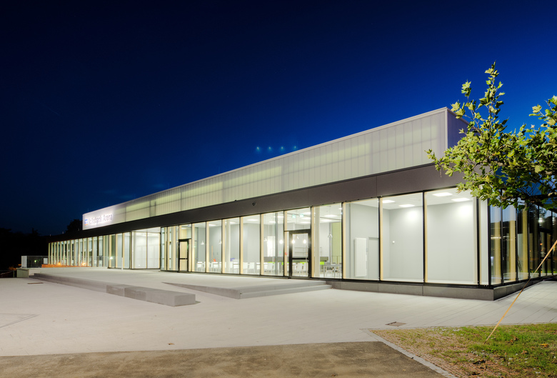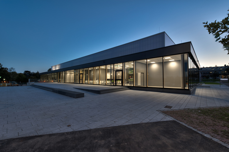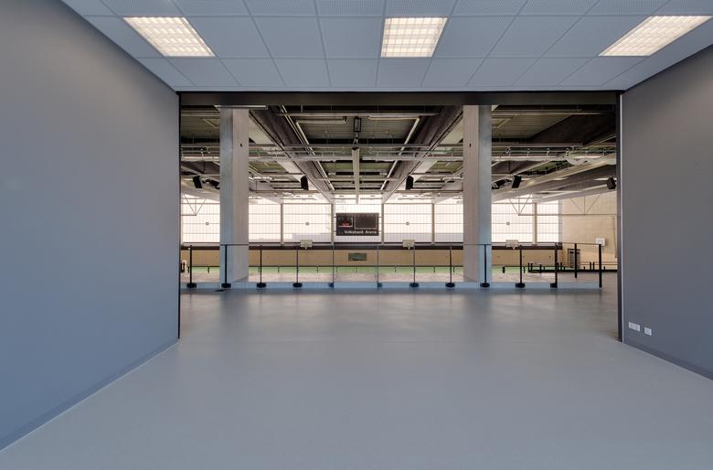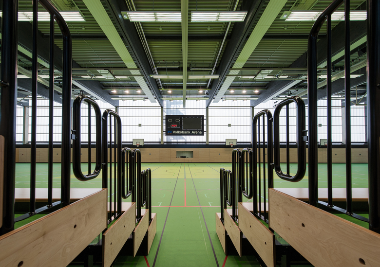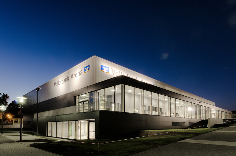 Der Neubau der Volksbank Arena steht in einem campusartigen, weitläufigen Schul- und Sportgelände. In Verbindung mit dem angelegten Baum-Carré ergibt sich eine gemeinsame Eingangszone mit schönem Bezug zum großen Sportplatz.