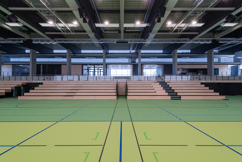 Die Sportarena ist vier-fach aufteilbar und weist eine lichte Raumhöhe von 9 m unter den Trägern der Dachkonstruktion auf. In der Arena befinden sich 1.020 Sitzplätze für Zuschauer. Behinderte Zuschauer können ihre Plätze barrierefrei und zentral hinter den fest installierten Besucherplätzen einnehmen. Auf der Sportebene befinden sich die Geräte- und Umkleideräume, die Besucher-WCs und die erforderlichen Technikräume. Über eine eingestellte Catering-Box wird der Flur, respektive Foyerbereich, gegliedert. Über mobile Wände ist eine diskrete Abtrennung des VIP-Bereichs einfach und unkompliziert möglich.