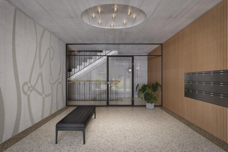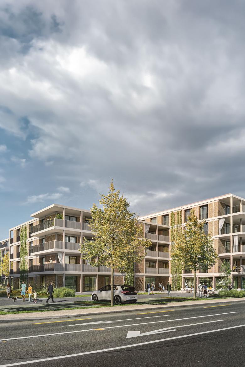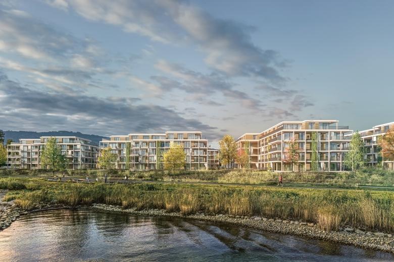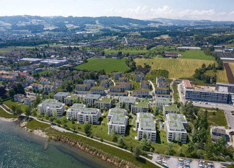 Es galt als Prämisse, möglichst allen Wohnungen den Blick auf den See zu bieten – auch im Bereich der höheren Bebauungstiefe im westlichen Teil des Areals. Die hochwertigeren Eigentumswohnungen liegen mit unverbaubarem Blick auf das Wasser an der Seefront. In zweiter Reihe und doch mit grosszügigen Durchblicken befinden sich die Mietwohnungen. Bei der Zufahrt zur Kantonshauptstrasse schaffen die zurückversetzten Bauvolumen einen Hof hin zur Stadt.