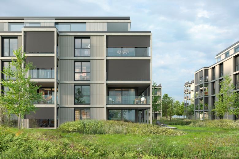 Hin zum See erweitern die Balkone und Loggien die Innenräume. Die «Boxen» mit den Privaträumen bilden die Grundstruktur; zwischen ihnen spannen sich die jeweiligen Wohnflächen auf. Balkone, die in ihren Tiefen variieren, lockern die gleichmässigen Fassaden auf. Zudem ermöglichen diese Auskragungen, dass die Bewohnerinnen und Bewohner einen Schritt aus der eigentlichen Gebäudehülle machen können, um die Umgebung unmittelbar zu erleben.