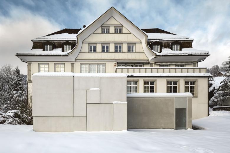 Das Hauptvolumen beherbergt den Operationssaal. Dessen Ausformulierung nach aussen orientiert sich an den historischen Fassaden des Bestandsgebäudes. In der thematischen Neuinterpretation des gestemmten Täfers mit seinen Friesen und Füllungen artikuliert sich eine zeitgemässe Architektursprache. Quadratische Grundmodule an Wänden und Dach sind frei mit skalierten Rechtecken kombiniert. Die Komposition der Betonelemente geschieht präzise über Eck. Abgestufte Modultiefen verleihen dem Baukörper zusätzlich Plastizität.