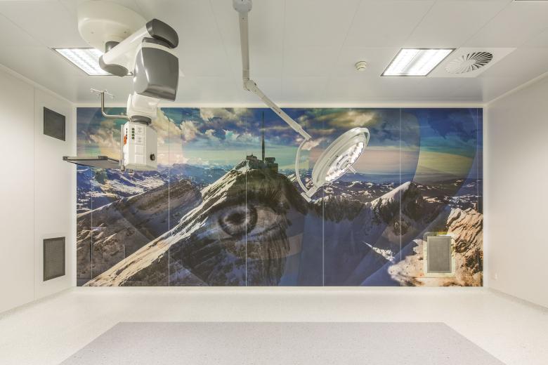 Das Wandbild im Operationssaal, eine Fotomontage, wurde von der Künstlerin Liliane Eberle erstellt und schafft mit dem alpinen Sujet einen direkten Bezug zur Region.