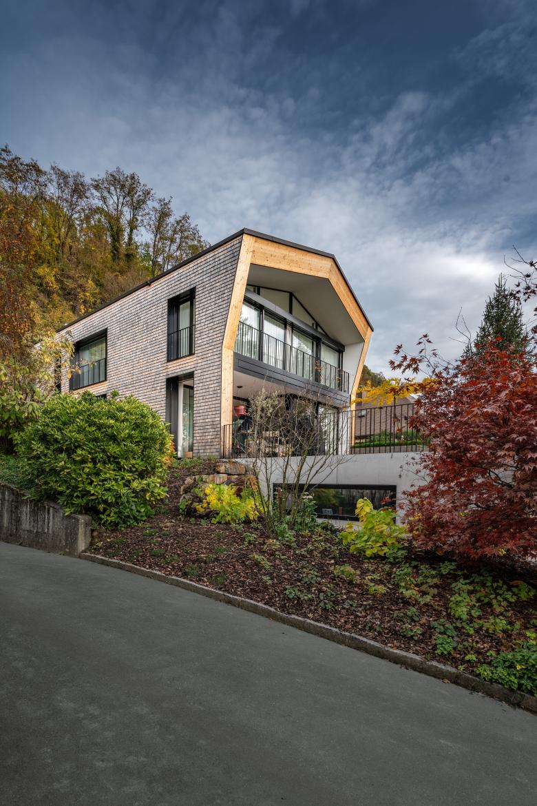 Auf einer schmalen Parzelle in Hanglage in Berneck ersetzt der zeitgemässe Neubau ein altes Einfamilienhaus. Das in den Hang eingebettete Sockelgeschoss bildet eine solide Basis, während der darauf platzierte Holzelementbau mit Satteldach harmonisch in die umliegende Bebauung Struktur integriert wird. Die architektonische Gestaltung vereint Funktionalität und Ästhetik, wobei die vorzufindende Hanglage geschickt genutzt wird. Das Satteldach umfasst den geschaffenen Wohnraum seitlich bis zum Boden, bildet eine Art «Röhre» und ermöglicht so eine einzigartige Erlebbarkeit der beiden Blickrichtungen: das Dorf einerseits und die Hanglage in entgegengesetzter Richtung. Von der Eingangstüre führt eine Sichtbetonwand zur Treppe, die den Besucher in die oberen Wohnung Schlafebenen leitet. Hier wird dem Bewohner durchgehend die Möglichkeit geboten, die beiden betonten Blickrichtungen zu erleben: die extrovertierte Aussicht zum Dorf und die introvertierte Ausrichtung Richtung des Hangfusses.
