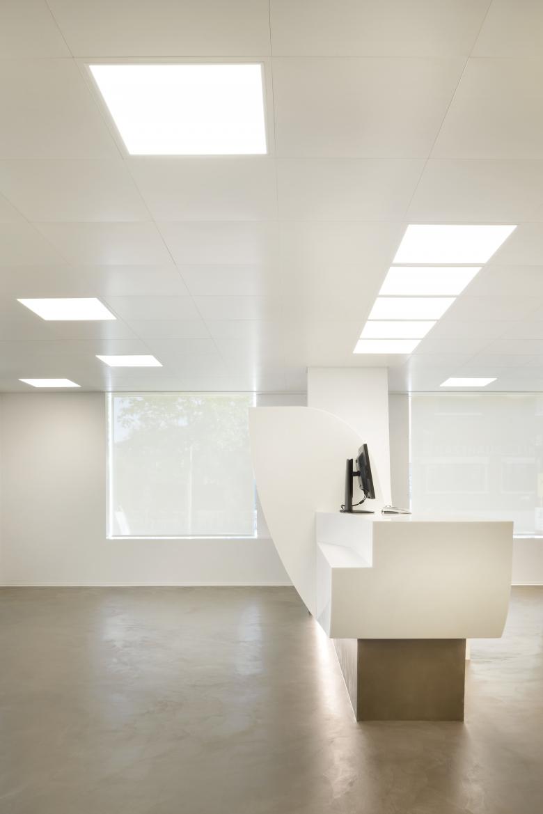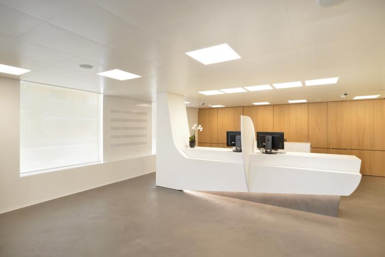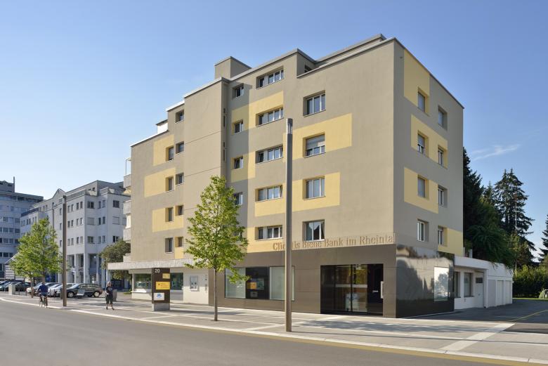 Im Inneren der Bank wurden vormals verschachtelte Raumstrukturen aufgelöst und funktional neu organisiert. Eine Kommunikationszone im Zentrum der Filiale bietet genügend Raum für Besprechungen sowie für kleinere Veranstaltungen. Wenige Materialien wie erdtonfarbige Bodenbeläge, massive Eichenmöbel und eine weisse Schaltertheke aus Verbundwerkstoff sorgen für eine angenehme Atmosphäre.
