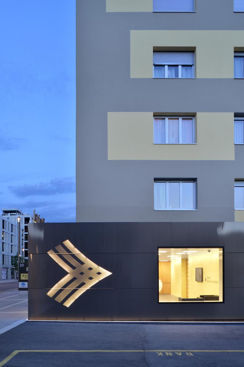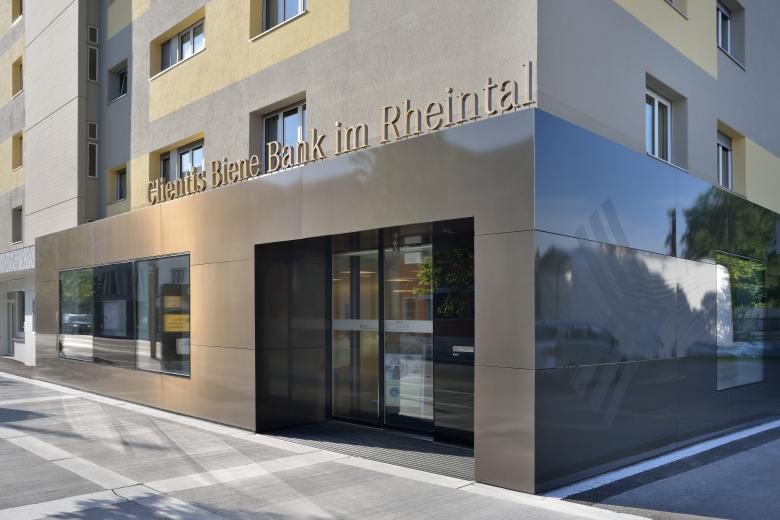Aufgabe war es, einem Wohn- und Geschäftshaus aus den 70er Jahren neuen Glanz zu verleihen, mit besonderem Augenmerk auf den Umbau und die Erweiterung der Biene Bank. Hierfür wurde im Erdgeschoss mit einem Kubus von klarer Präsenz auf die neu gestaltete Bahnhofstrasse geantwortet. Schlicht und mondän durch Aluverbundplatten in Messing-Optik und grosszügigen Fensterflächen tritt die neue Filiale in Erscheinung. Bienengelbe Farbflächen umrahmen die Fenster des Wohnhauses und verleihen der in die Jahre gekommenen Fassade belebende Frische.