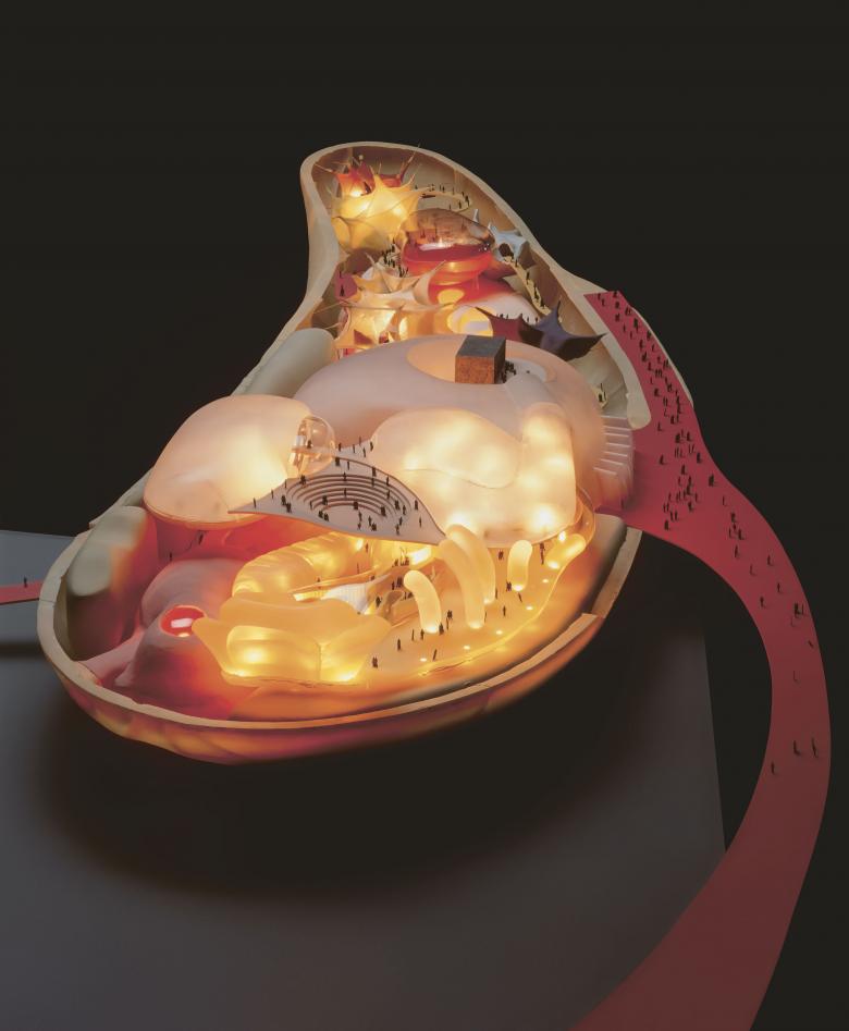 Yverdon-les-Bains: Das Forum Yverdon verkörpert in Form und Materialisierung einen Organismus. In dessen Herz fliessen die Themenkreisläufe zusammen. Das Publikum betritt symbolisch einen Blutkreislauf.