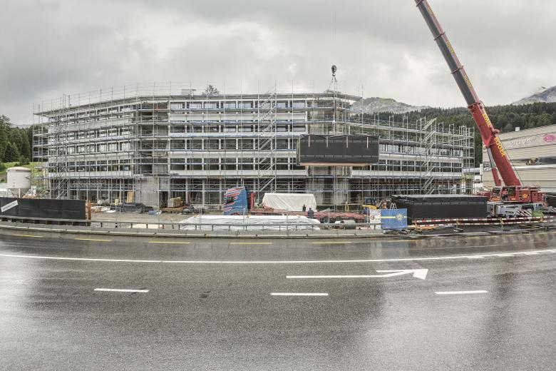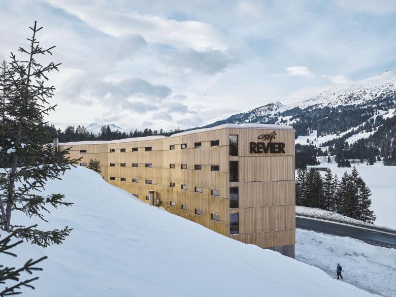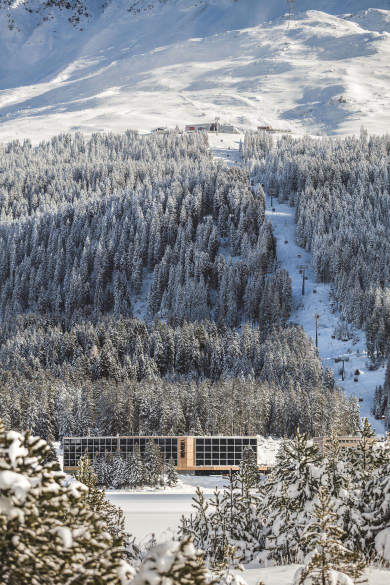 Das gestreckte, schmale Gebäude steht an der steilen Geländekante mit dem ausgedehnten Bergwald im Rücken. Es folgt mit zwei sanften Knicken bogenartig der Uferlinie des Heidsees. Einladend wendet sich der Kopfteil, in dem Lobby, Bar und Restaurant untergebracht sind, zur Talstation der Bergbahn. Weitere vier Stockwerke mit insgesamt 96 Zimmern liegen auf dem massiven Erdgeschoss-Sockel, in dem sich grosszügig angelegt auch Wintersport- und Bike-Raum befinden.