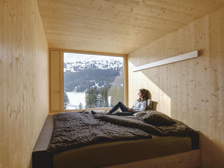 Luxus in der Einfachheit – Im Hotel Revier umgibt aparte Schlichtheit die Gäste. Die Unterkünfte entfachen das Freiheitsgefühl eines Campers, die urige Stimmung einer Berghütte und die Funktionalität einer Schiffskoje. Dabei bestimmen die ortsspezifischen Gegebenheiten die konzeptionelle Reduziertheit des Baus.