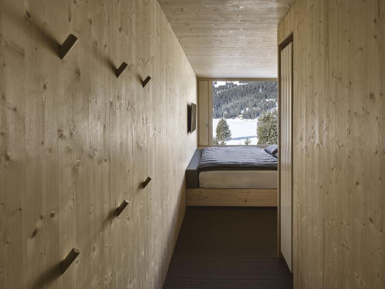 Die Zimmer sind als komplett vorgefertigte Module in Brettsperrholz ausgeführt. Dabei besticht das reine Konstruktionsholz ohne Aufdopplung als Tragwerk, Raumtrennung und Oberfläche zugleich. Durch das Aneinanderreihen der Zimmer ergibt sich eine Zweischaligkeit, die nicht zuletzt für besseren Schallschutz sorgt. Die Badezimmer sind als Boxen in die Räume integriert.