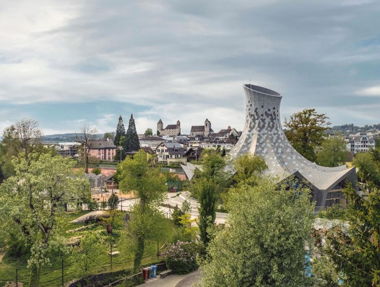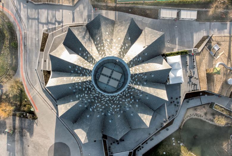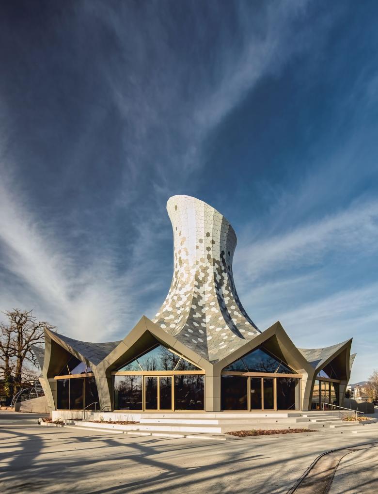 Dank der Holzbauweise mit vorgefertigten Elementen war die Bau- und Montagezeit kurz und effizient. Mit ihrem Gewand aus schimmernden Metallschuppen und einer Höhe von 25 Metern hat die Konstruktion die für den Kinderzoo erwünschte Ausstrahlungskraft und prägt zugleich die Stadtsilhouette.
