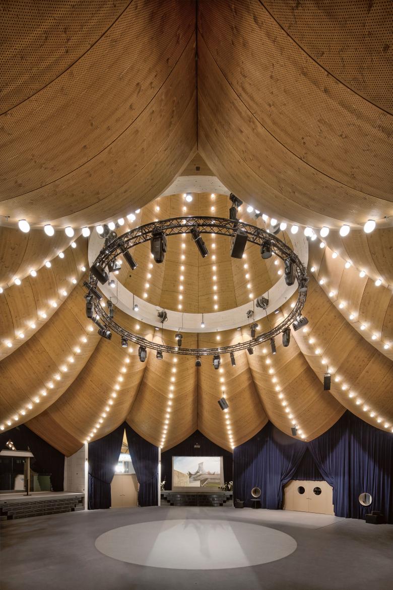 Das Siegerprojekt des Architekturwettbewerbs dient als Spielstätte für Vorführungen und als Saal für Veranstaltungen ausserhalb des Tagesprogramms. Die freitragende Faltwerkbedachung verleiht der zentral angelegten Arena ihren spektakulären Charakter. In seiner umschliessenden Qualität sorgt dieser Baldachin für ein sanftes Raumgefüge und trägt zur ausgewogenen Akustik bei. Terrassierte Ebenen und vorgelagerte Sitzstufen fügen den Neubau in den bestehenden Kontext ein. Im Norden liegt das Dach auf den Nebenräumen der Manege. Sie bilden den Rücken des Gebäudes.