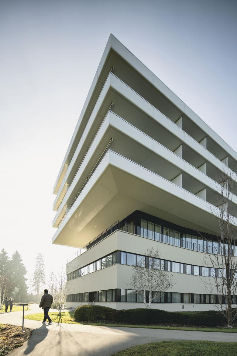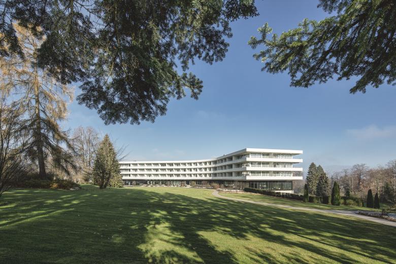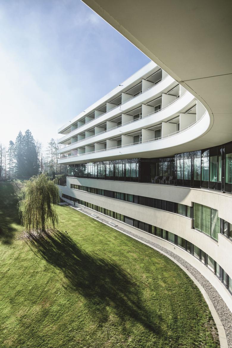 Die Grossform des neuen Kurhauses Oberwaid entwickelte sich aus dem Bedürfnis nach viel Tageslicht. Vom obersten Teil des Parks bis zur Strassenebene fällt die Parzelle um 21 Höhenmeter. Geschickt in diese anspruchsvolle Topografie gesetzt, empfängt das Taukreuz auf der Eingangsseite die Besucherschaft mit offenen Armen. Damit die Gäste direkt vor die Lobby fahren und beim Betreten des Kurhauses den einladenden Park wahrnehmen können, führt eine Auffahrt von der Strasse zum Gebäudeeingang.