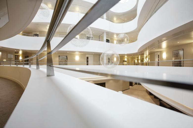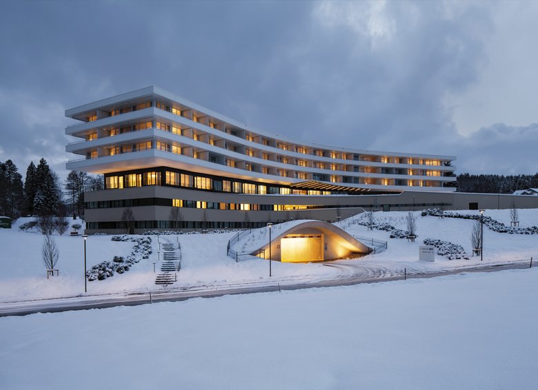 Die dynamische Form des Baukörpers greift die Trias symbolisch auf und entspricht ihr funktionell wie atmosphärisch. Das Gebäude entwickelt sich mit einem zweigeschossigen Sockel, einer öffentlichen «Fuge» darüber und drei Gästezimmergeschossen in die Höhe. Die Mitte des Kurhauses bildet ein lichtdurchflutetes Atrium.