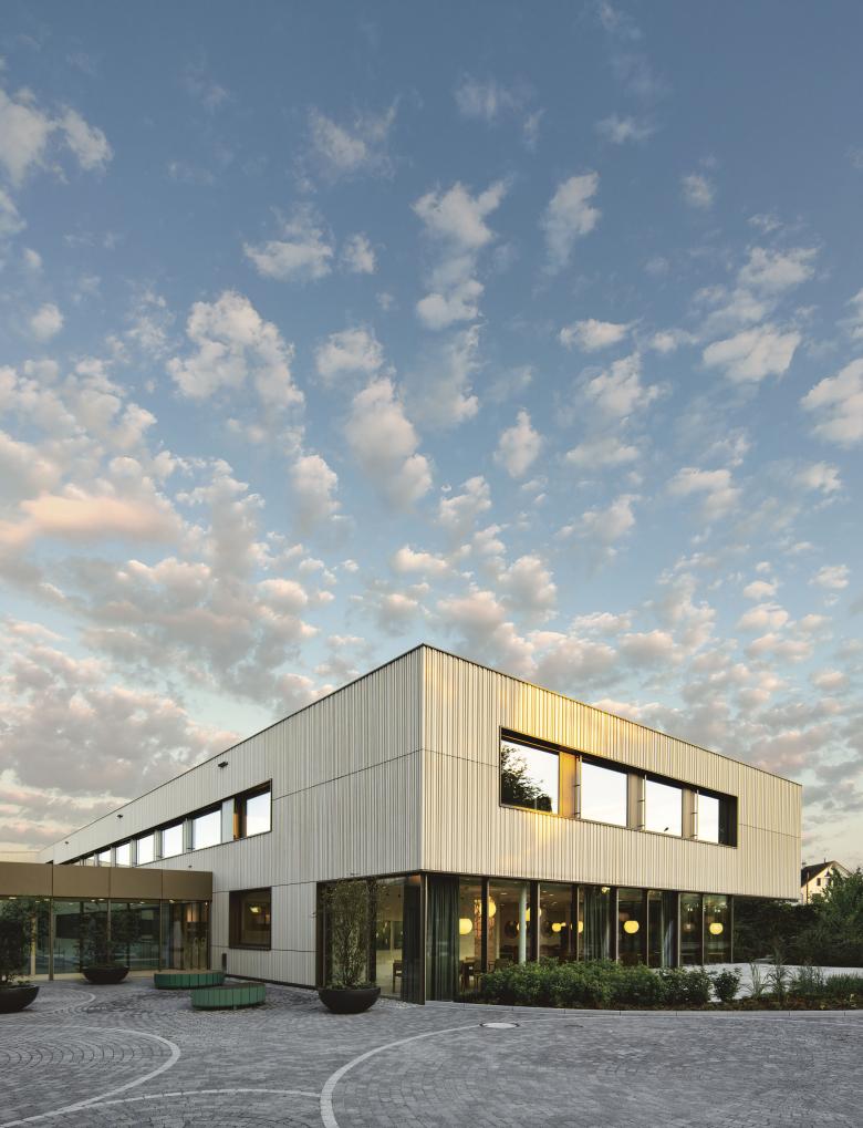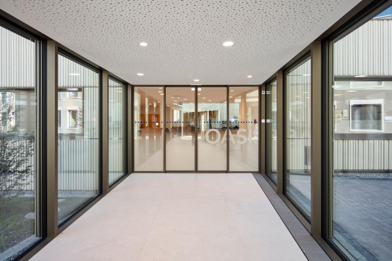 Entlang der Baulinie gesetzt, reagiert das Gebäude mit seiner geknickten Form und der weissen Keramikfassade auf die topografischen Gegebenheiten. Gleichzeitig bildet es den Abschluss des Spitalkomplexes. Das dreigeschossige Klinikum schliesst synergetisch an die bereits bestehende Bausubstanz an und präsentiert sich als elegant fliessendes Raumgefüge. Über eine Passerelle gelangt man vom Haupteingang der benachbarten Einrichtung in den Neubau mit heller, einladender Lobby.