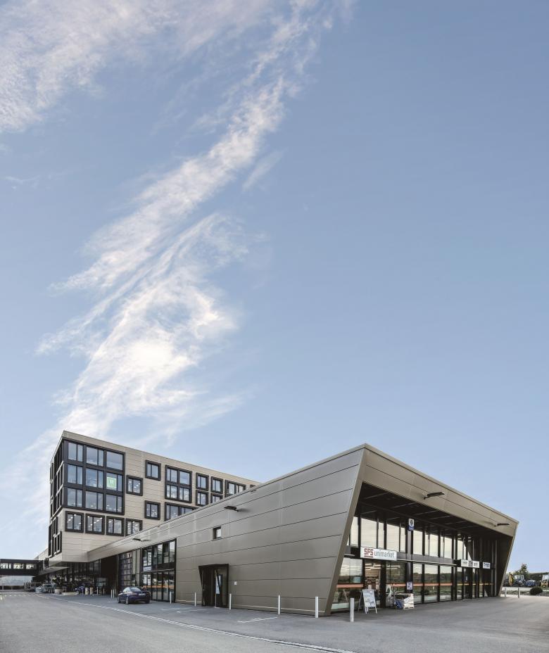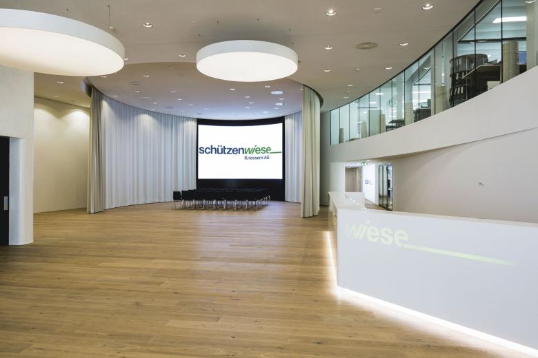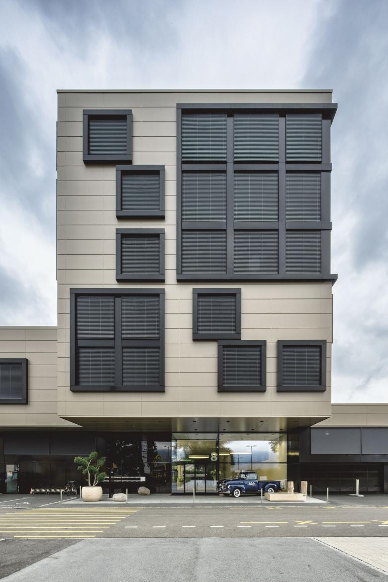 Markant liegt der Büro- und Industriepark Schützenwiese wie ein Flaggschiff direkt an der Autobahneinfahrt. Der zentrale, über die gesamte Breite ragende Büroturm fügt die seitlichen Produktionsflügel einheitlich in den dynamischen Baukörper ein. Rampen gleichen die topografischen Unterschiede aus. Sie erschliessen mehrere vollwertig nutzbare Niveaus.