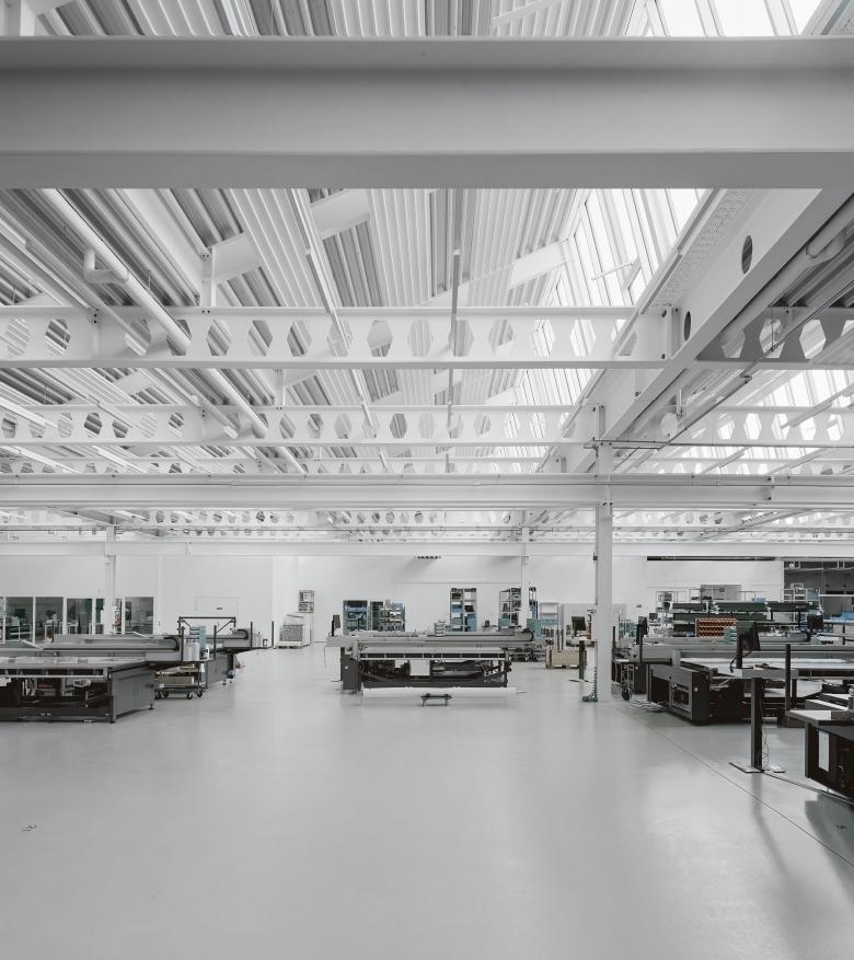 Im Norden docken zwei hohe Produktionsgeschosse an den Büroturm an. Der südliche Sektor mit Geschäften ist eingeschossig, teilweise mit Zwischenebenen gestaltet. Die Halle im Zentrum des Büroturms bildet das repräsentative Entrée für die ansässigen Firmen. Um der Nutzerschaft Optionen für künftiges Wachstum und Umstrukturierungen zu gewährleisten, sind die stützenlosen Stockwerkebenen im Verwaltungsbau funktional offengehalten. Dadurch wirkt die Struktur wie eine flexible Raummaschine.