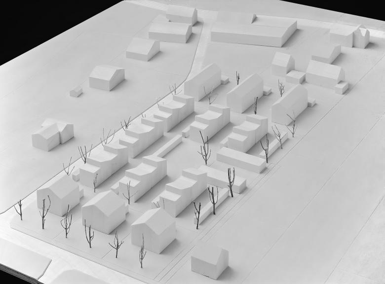 Alle Fassadenöffnungen sind in der ganzen Siedlung auf zwei Standardgrössen festgelegt. Im Inneren halten die tragenden Aussenwände die Etagen frei von Gliederungen. Lediglich die Treppe strukturiert den Raum. Sie ist in jedem Haus gleich gesetzt. Die Auftraggebenden planten ihr spezifisches Raumprogramm und die Bespielung sämtlicher Oberflächen gemeinsam mit den Architekten. Durch die aktive Einbindung der Eigentümerinnen und Eigentümer vor Baubeginn konnte sich früh ein starkes Gemeinschaftsgefühl entwickeln.