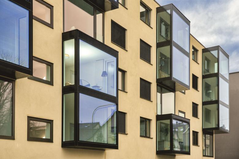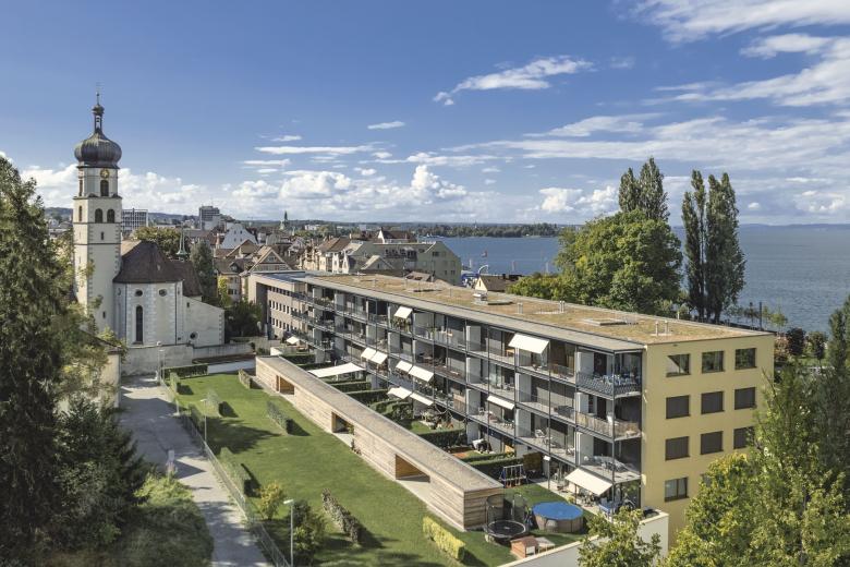 Der langgestreckte Baukörper umfasst fünf Vollgeschosse, deren an der Nordfassade allseitig verglaste Erker als Quader hervortreten und pittoreske Ausblicke auf den Bodensee gewähren. Stilistisch orientiert sich das Stadthaus dabei an den charakteristischen Vorbauten der Altstadthäuser und übersetzt so den traditionellen Baustil elegant in die Gegenwart.