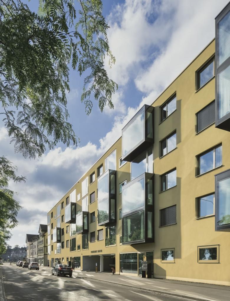 Das Gebäude befindet sich am östlichen Stadtrand von Rorschach und bildet gemeinsam mit dem Neubau der Raiffeisenbank den Eingang in die historische Innenstadt. In enger Kooperation mit Behörden und Denkmalpflege erarbeitete das Projektteam ein ortsbauliches und architektonisch angemessenes Bebauungskonzept entlang der Hauptstrasse.