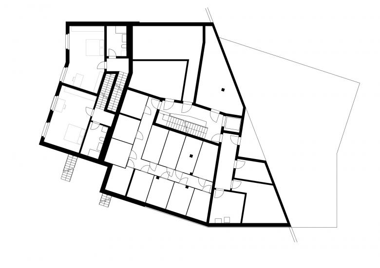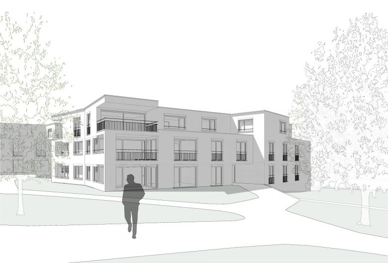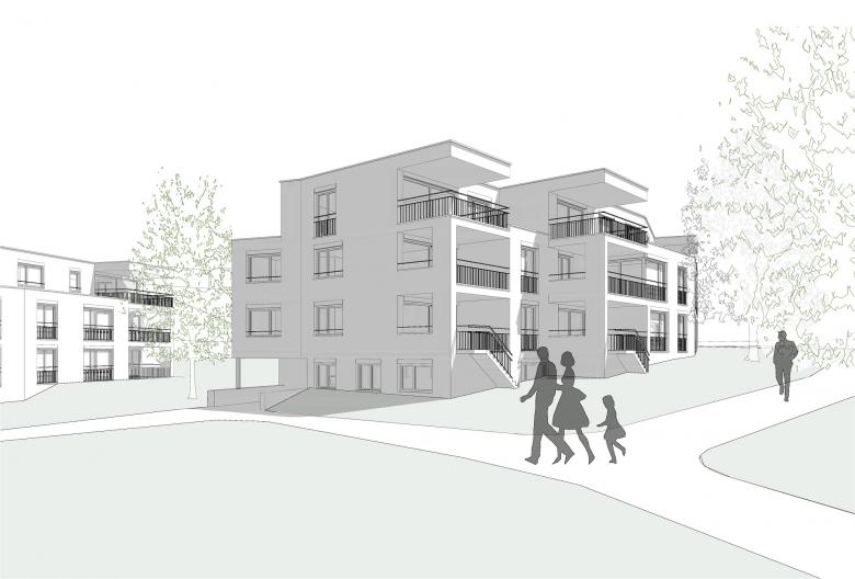 Da wenig Strassenanstoss zur Verfügung steht ist es für eine funktionierende Adressbildung wichtig, eine identitätsstiftende Mitte auszubilden, von der aus die einzelnen Häuser erschlossen werden. Eine offene Bebauungsstruktur schafft fliessende Übergänge zu den bewohnten Nachbargrundstücken, der Landschaft und dem attraktiven Bachlauf. Die vier westlich angeordneten Baukörper folgen der Bachlinie und sind, um u.a. den Arealzuschnitt optimal auszunutzen, in ihrer Stellung zueinander leicht aufgespreizt. Neben einer regelmässigen Gebäudeanordnung und einer klaren Strukturierung der z.T. darunter liegenden Einstellhalle, resultieren spannungsvolle und abwechslungsreiche Zwischenräume. Die Fassadenabstände sind angemessen, die Aussichten aus den Wohnungen durch die leichten Baukörperabdrehungen optimiert. Die Hauszugänge liegen auf der Erdgeschossebene an der Nordostseite, so dass die privaten Aussenbereiche und die Wohnräume möglichst nicht tangiert werden. Die drei östlich angeordneten Bauten sind analog orientiert, verfügen durch die schräg verlaufende Grundstücksgrenze aber über eine grössere Verschiebung zueinander. Die Hauszugänge liegen hier im Untergeschoss, so dass das Erdgeschoss analog dem Obergeschoss ausgebildet werden kann. Der achte Baukörper an der Strasse hat eine vermittelnde Funktion. Dank der Gewerbenutzung im Erdgeschoss ist die Lage an der Strasse ideal und bildet mit dem angrenzenden Gebäude, das zur Hälfte über eine Gewerbenutzung verfügt, einen einladenden Auftakt in die Siedlung. Je Geschoss sind vier Wohnungen so angeordnet, dass die Wohnräume nach SüdOsten, Süden, Süd-Westen oder Westen orientiert sind.
