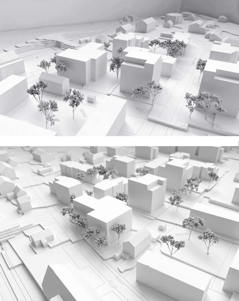 Das Mehrfamilienhaus an der Hardstrasse ergänzt auf der noch freien Fläche die beiden 2012 - 2018 erstellten Ersatzneubauten. Innerhalb des ortsbaulichen Gesamtkonzeptes wird der Neubau in die Siedlungsstruktur eingefügt. Der neue fünfgeschossige Baukörper übernimmt die Ausrichtung und Höhen der Nachbarbauten und unterscheidet sich bewusst von den beiden turmartigen Solitärbauten an der Kapellstrasse.