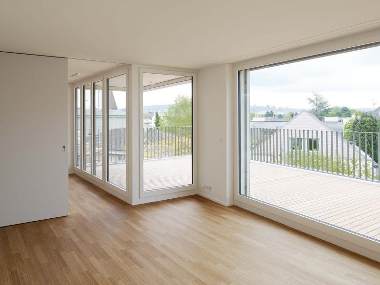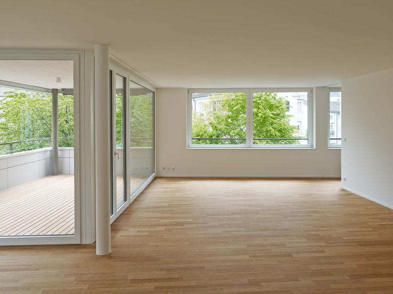 Der Ersatzneubau passt sich mit einer gewissen Zurückhaltung in die komplexe Grundstücksgeometrie und das uneinheitliche Umfeld ein. Die beiden bestehenden 50-jährigen Hainbuchen wurden bei der Setzung und der Grundrissgestaltung einbezogen. Sie betten den Neubau städtebaulich in das Quartier ein und schaffen gleichzeitig interessante Aussenbezüge aus den Wohnungen. Alle 9 Wohnungen sind dreiseitig orientiert und mit grosszügigen, loggienartigen privaten Aussenräumen ausgestattet.