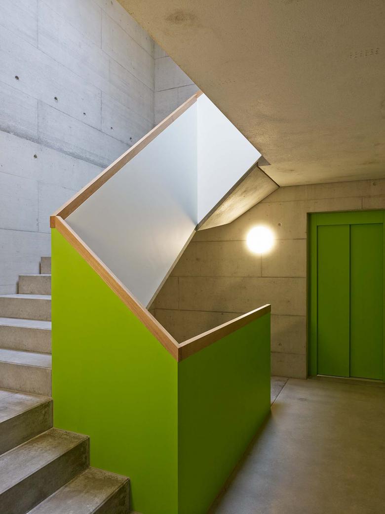 Der Baukörper bildet so vier unterschiedliche Seiten aus. Es entstehen differenzierte Orte die das Haus in Beziehung zu seiner unmittelbaren Umgebung setzen. Eine Haltung die versucht, die vorhandene Massstäblichkeit im sich stark verändernden Quartier zu erhalten bzw. zu interpretieren: Die Schichtung der grossformatigen Faserzementplatten integriert die Fensterund Balkonbrüstungen, zeichnet durch die horizontale Schuppung der Fassadenplatten je nach Lichtsituation mehr oder weniger und nimmt so die umliegenden, zum Teil muralen, zum Teil mit Fensterbändern versehenen Fassaden auf.