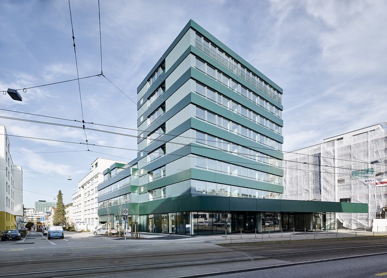 Die bestehende Fassade mit den Waschbetonbrüstungen und Ortbetonwand scheiben wird aussen aufgedämmt und mit einer hinterlüfteten Verkleidung aus Metall versehen. Die äussere Erscheinung mit den charakteristischen Fenstern und Brüstungsbändern bleibt erhalten und wird durch die subtil differenzierte Fassadenverkleidung sowie der „Kopfausbildung“ zur Badenerstrasse gestalterisch verfeinert.