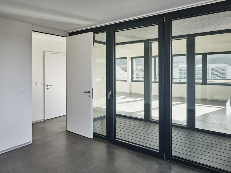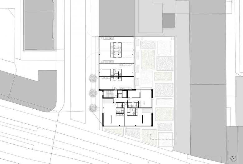 Die gut einsehbare Dachfläche über dem Erdgeschoss wird in Felder mit unterschiedlicher Extensivbegrünung sowie Schüttungen gegliedert und gestaltet. Die Baumreihe entlang der Bachmattstrasse bildet einen adäquaten Übergang vom urbanen Strassenraum zur öffentlichen Nutzung im Erdgeschoss und manifestiert gleichzeitig die Adressbildung der neuen Bachmattstrasse 59.