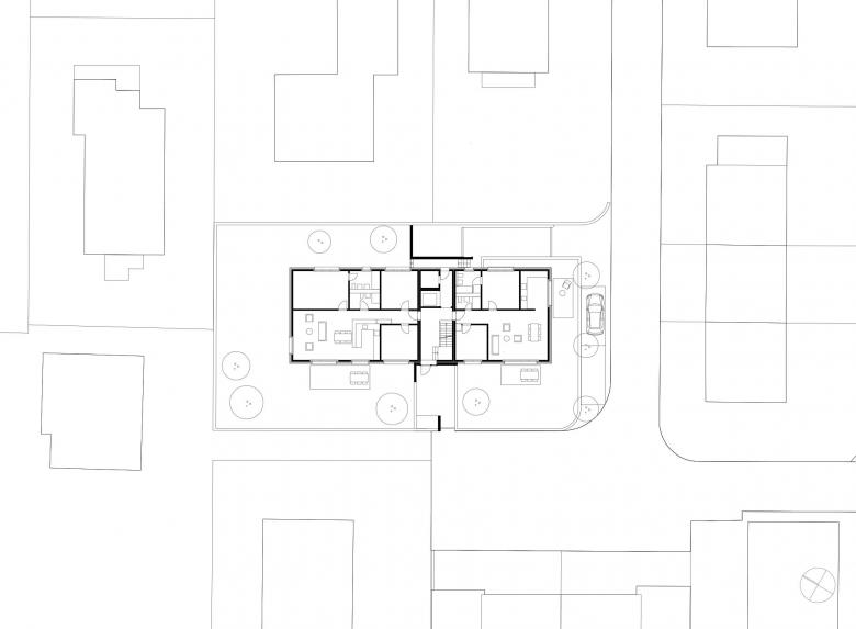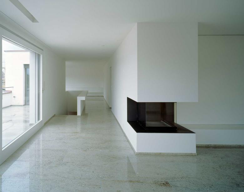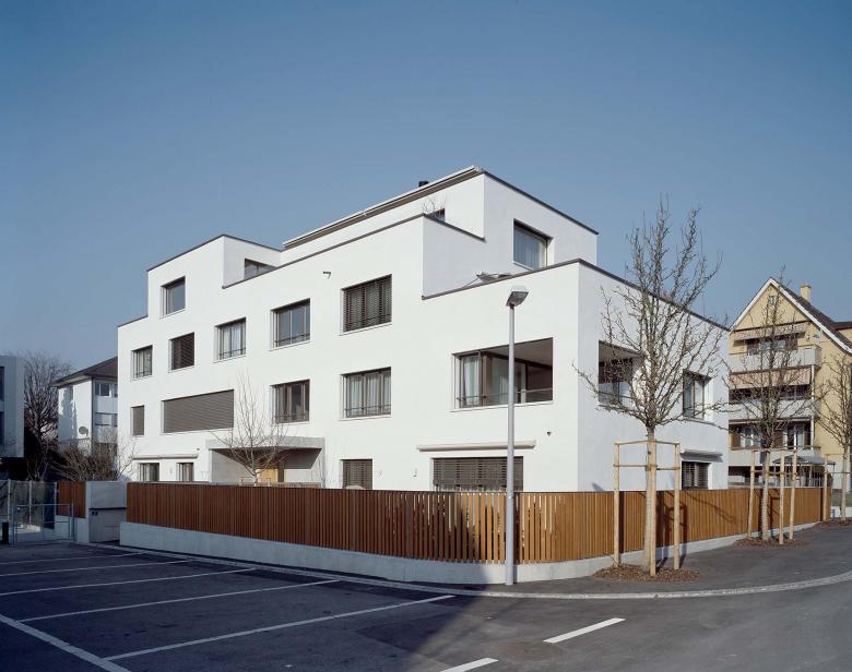 Vielgestaltige, in Ausdruck und Volumen unterschiedliche Bauten prägen das Quartier Heslibach. Der verputzte, gestufte Baukörper ist, obwohl eigenständig, zurückhaltend und vermittelnd in das bestehende Quartier eingefügt. Die fünf Wohnungen weisen unterschiedliche Qualitäten auf. In den beiden obersten Geschossen die grosszügige Maisonettewohnung mit direkt durch den Lift erschlossenem Attikageschoss, den zu Bergen und See ausgerichteten Terrassen und dem darunterliegenden Schlafgeschoss. Das unabhängig erschlossene Studio kann in die Wohnung integriert werden. Im Erdgeschoss und im 1.Obergeschoss befinden sich je zwei Geschosswohnungen mit grosszügiger Loggia bzw. Garten. Hecken, Loggien und Dachterrassen schaffen gut abgeschirmte private Aussenräume. Die Kompaktfassade mit horizontal abgezogenem Waschputz gibt dem Haus mit den dunklen Holz-Metallfenstern einen dem Quartier angemessen Ausdruck von unauffälliger Eleganz.