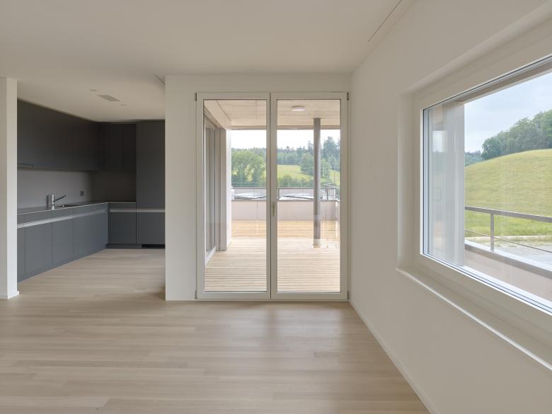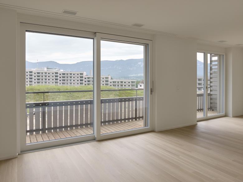 Die Grundrisse sind segmentweise um innenliegende Treppenhäuser entwickelt. Die Wohnungen sind zumeist zweiseitig orientiert, wobei alle von dem Sicht auf dem grosszügigen Grünraum profitieren.