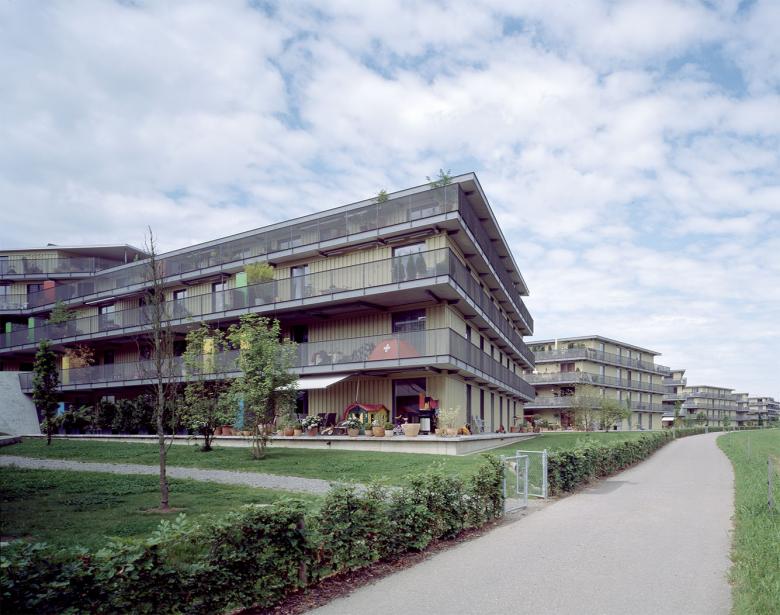 Sieben Baukörper stehen aufgereiht entlang der Wolfswinkelstrasse. Sie orientieren sich in ihrer Dimensionierung an der umgebenden Bebauung. Quer zur Strasse gestellt, erlauben sie den Durchblick in die offene Landschaft. Die einzelnen, dreigeschossigen Häuser bilden durch Knickung der Fassaden grosszügige interne Siedlungsräume. Die Einschnürung schafft zwei zentrale Schwerpunkte im Gebäude. Hier liegen die grosszügigen, von oben belichteten Erschliessungshallen. Die Wohnhäuser der ABZ stehen in einem grosszügigen Park. Der Niveauunterschied von ca. einem Geschoss wird durch eine bespielbare Böschung ausformuliert, die den Durchfluss der Landschaft unterstützt und den Blick in die Weite ermöglicht. Die Überbauung wurde im Minergiestandard ausgeführt.