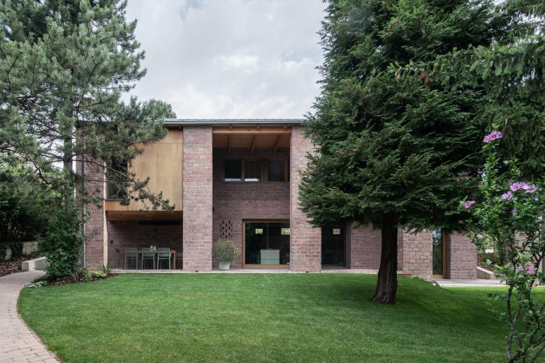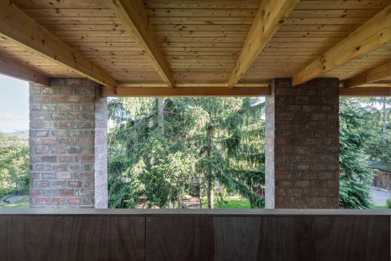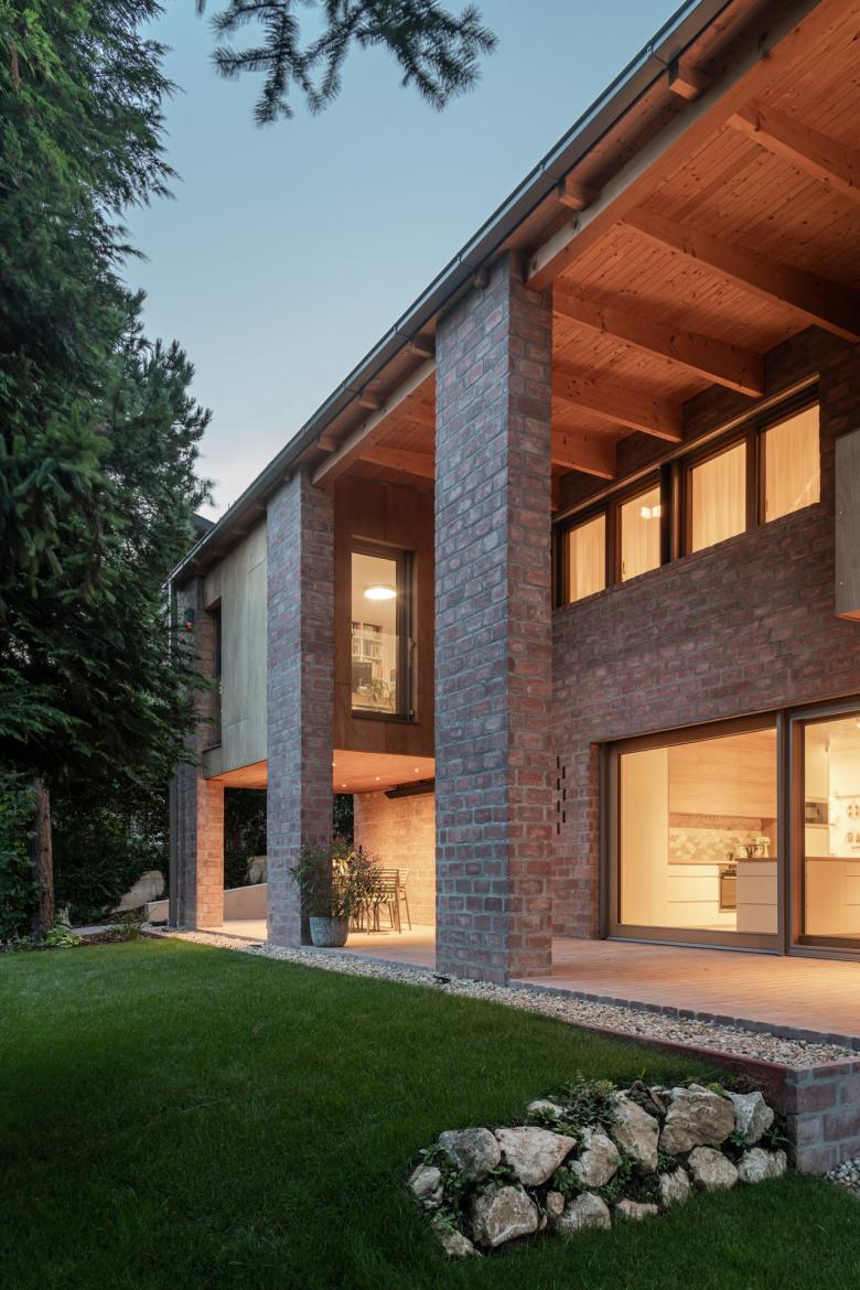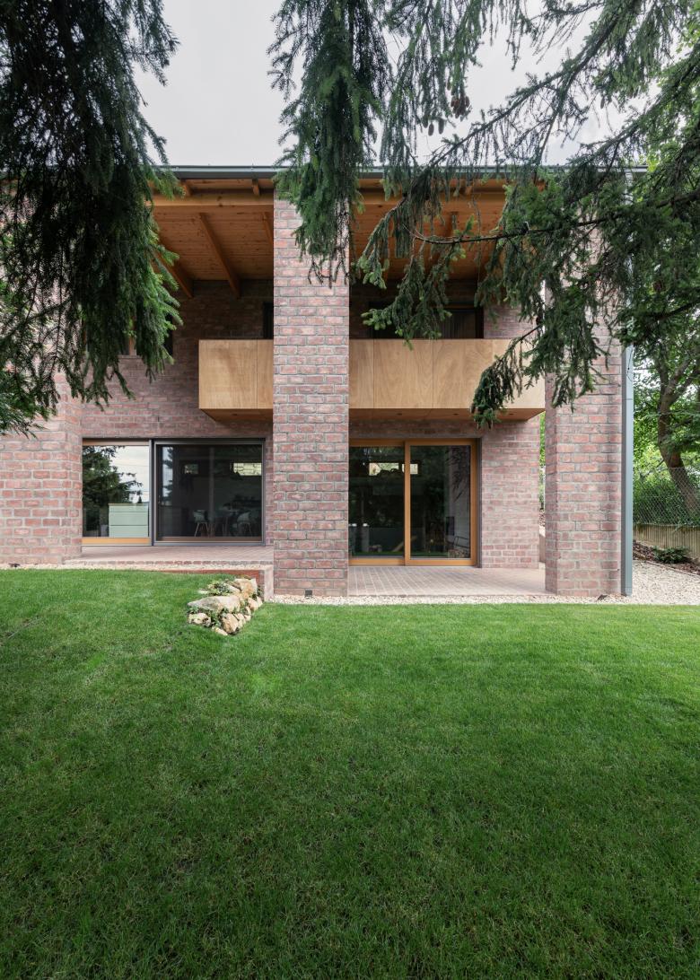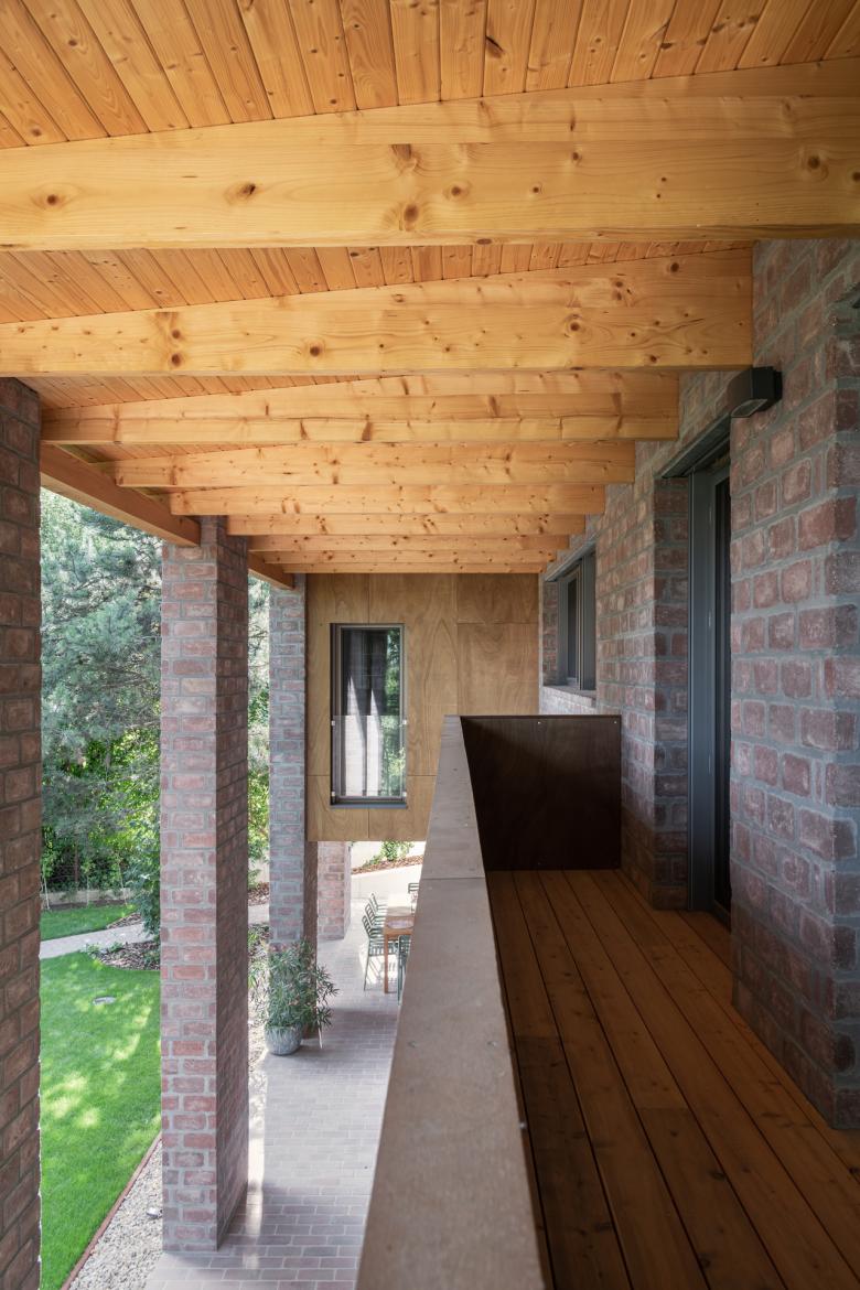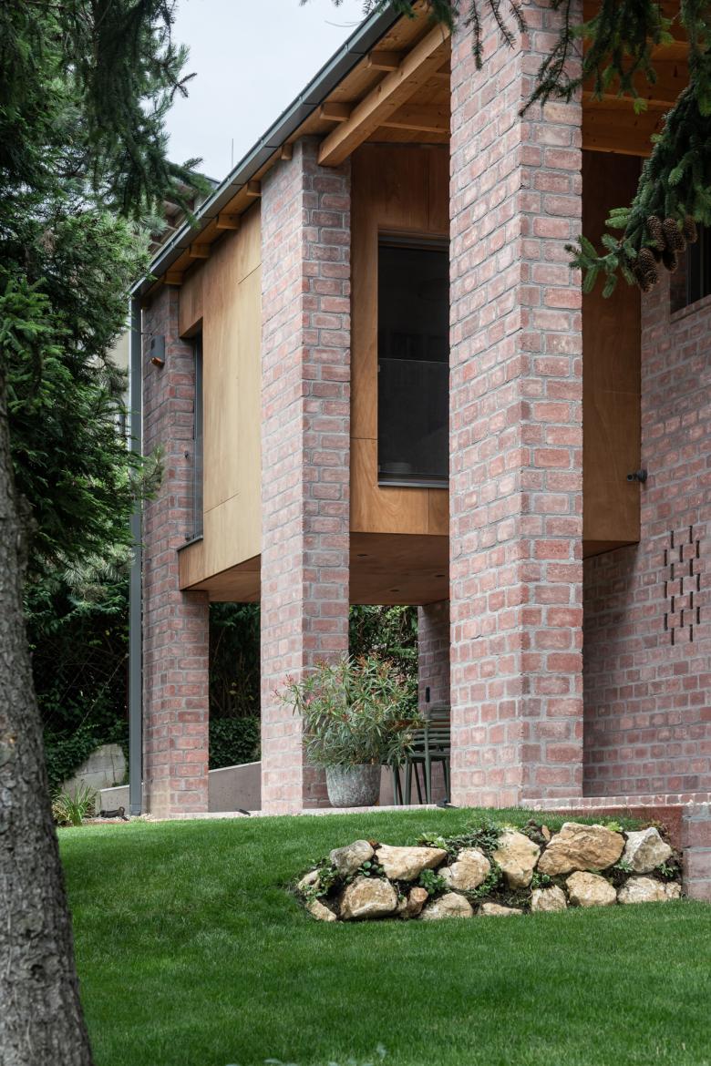 The house stands on a sloping hillside scattered with pinetrees, in the town of Nagykovácsi. The main architectural element is the two-storey high semi-open porch attached to the southern side of the building. The five robust brick pillars of the porch stand in contrast with the floaty wooden boxes incorporating the balcony and the work-room seeming to levitate between them. The porch has an important role acting as a shading system thus contributing to a balanced indoor climate. Furthermore it offers ideal setting for outdoor family life all year long whether functioning as a playground for the kids or sheltering populous family gatherings.