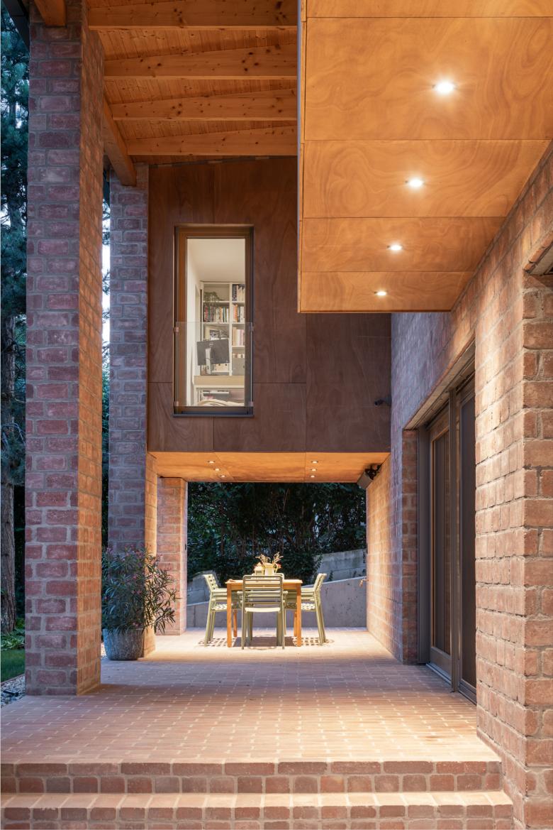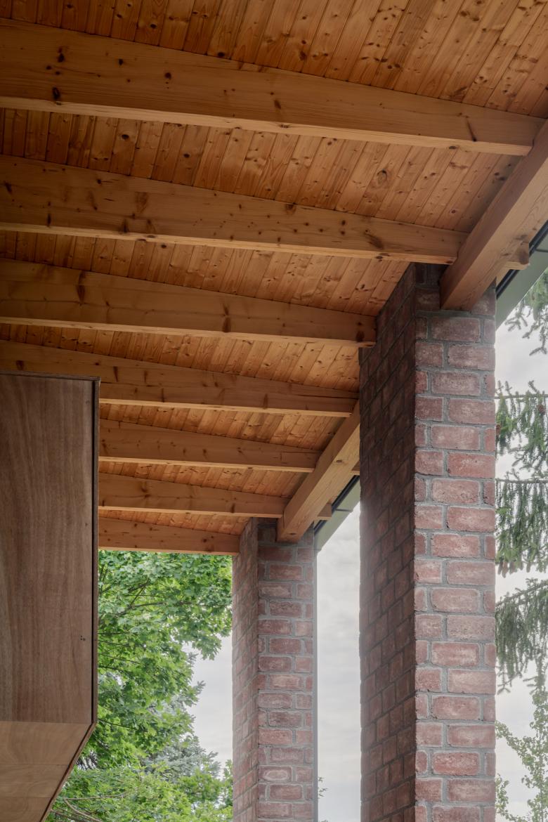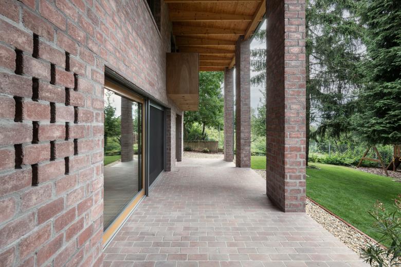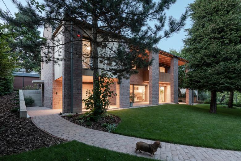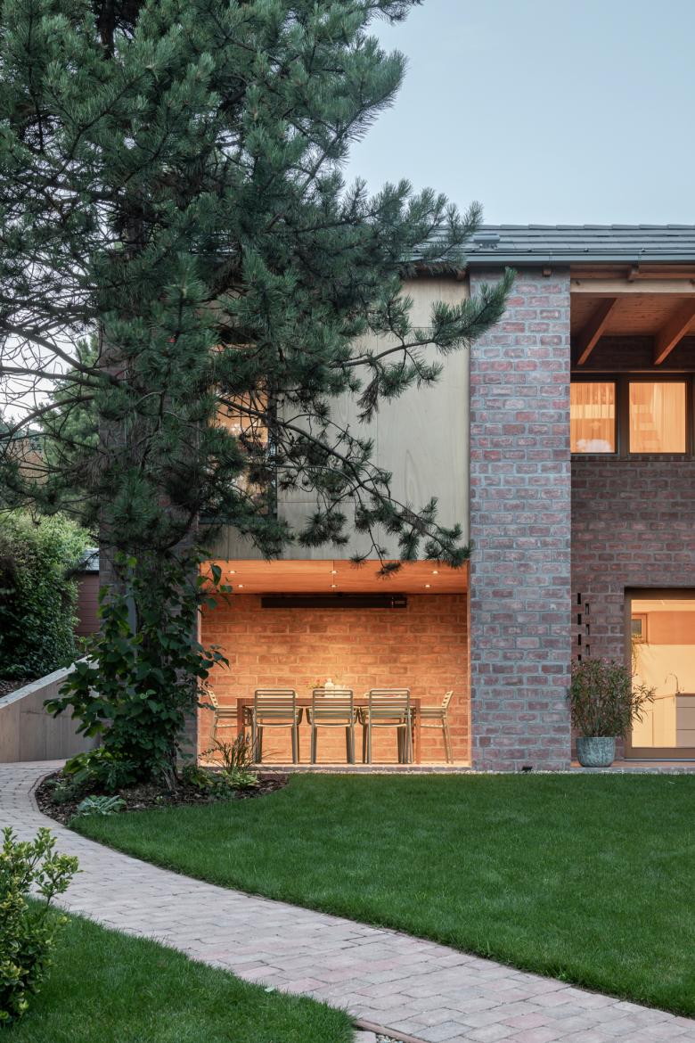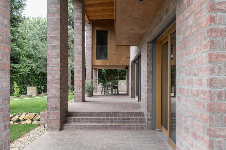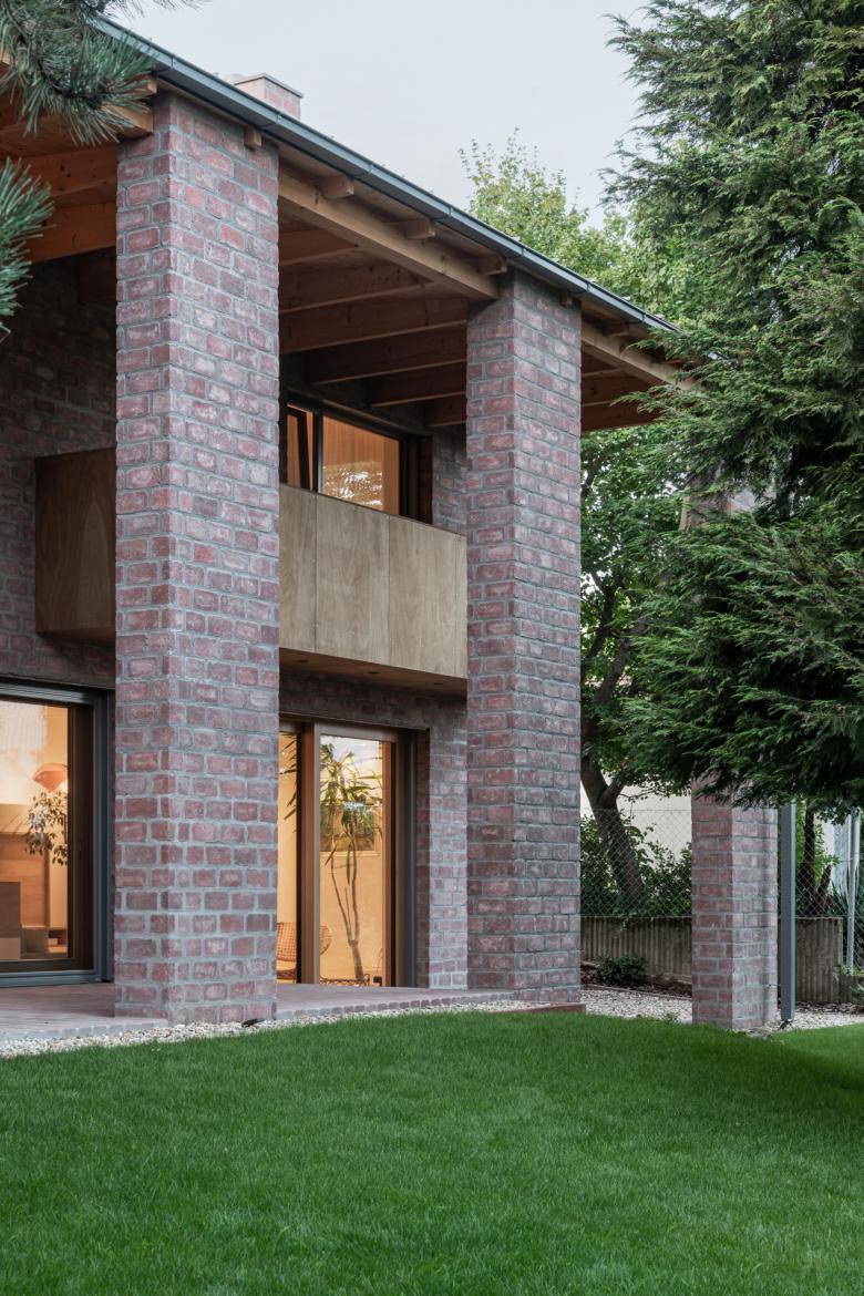 The house stands on a sloping hillside scattered with pinetrees, in the town of Nagykovácsi. The main architectural element is the two-storey high semi-open porch attached to the southern side of the building. The five robust brick pillars of the porch stand in contrast with the floaty wooden boxes incorporating the balcony and the work-room seeming to levitate between them. The porch has an important role acting as a shading system thus contributing to a balanced indoor climate. Furthermore it offers ideal setting for outdoor family life all year long whether functioning as a playground for the kids or sheltering populous family gatherings.